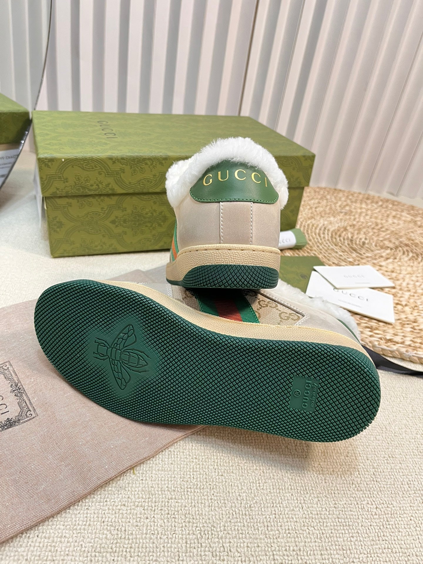 SNEAKER WITH WEB IN BEIGE GREEN FABRIC MIX SUEDE AND LAMB WOOL LINING
