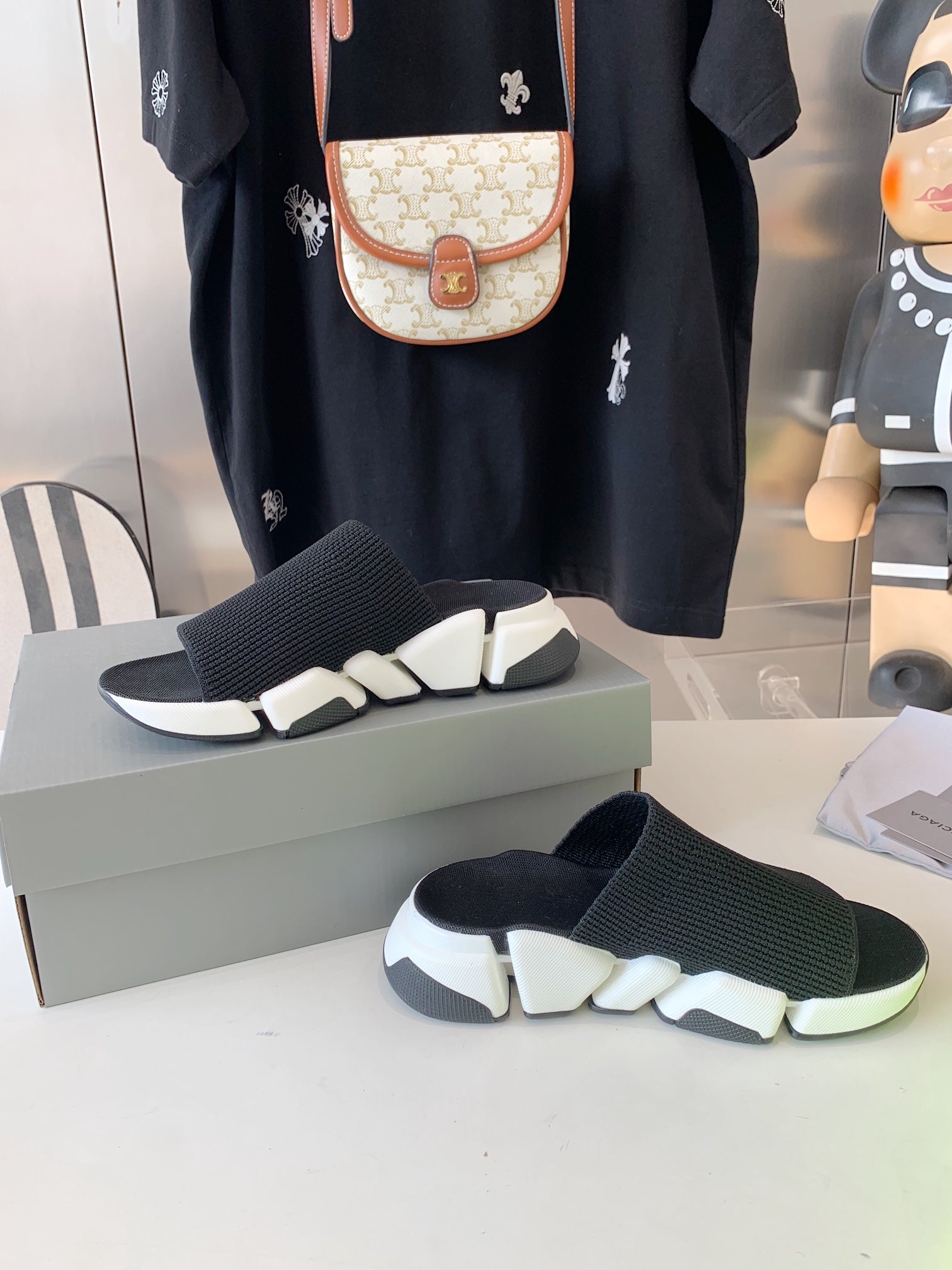 SPEED 2.0 SLIDE SANDAL IN BLACK RECYCLED KNIT AND WHITE SOLE
