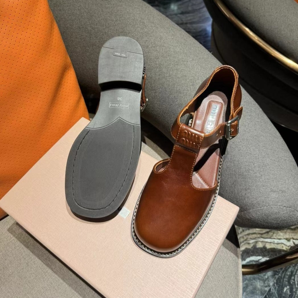 Square Toe Thick Heel Retro Mary Jane Shoes Chestnut Calfskin