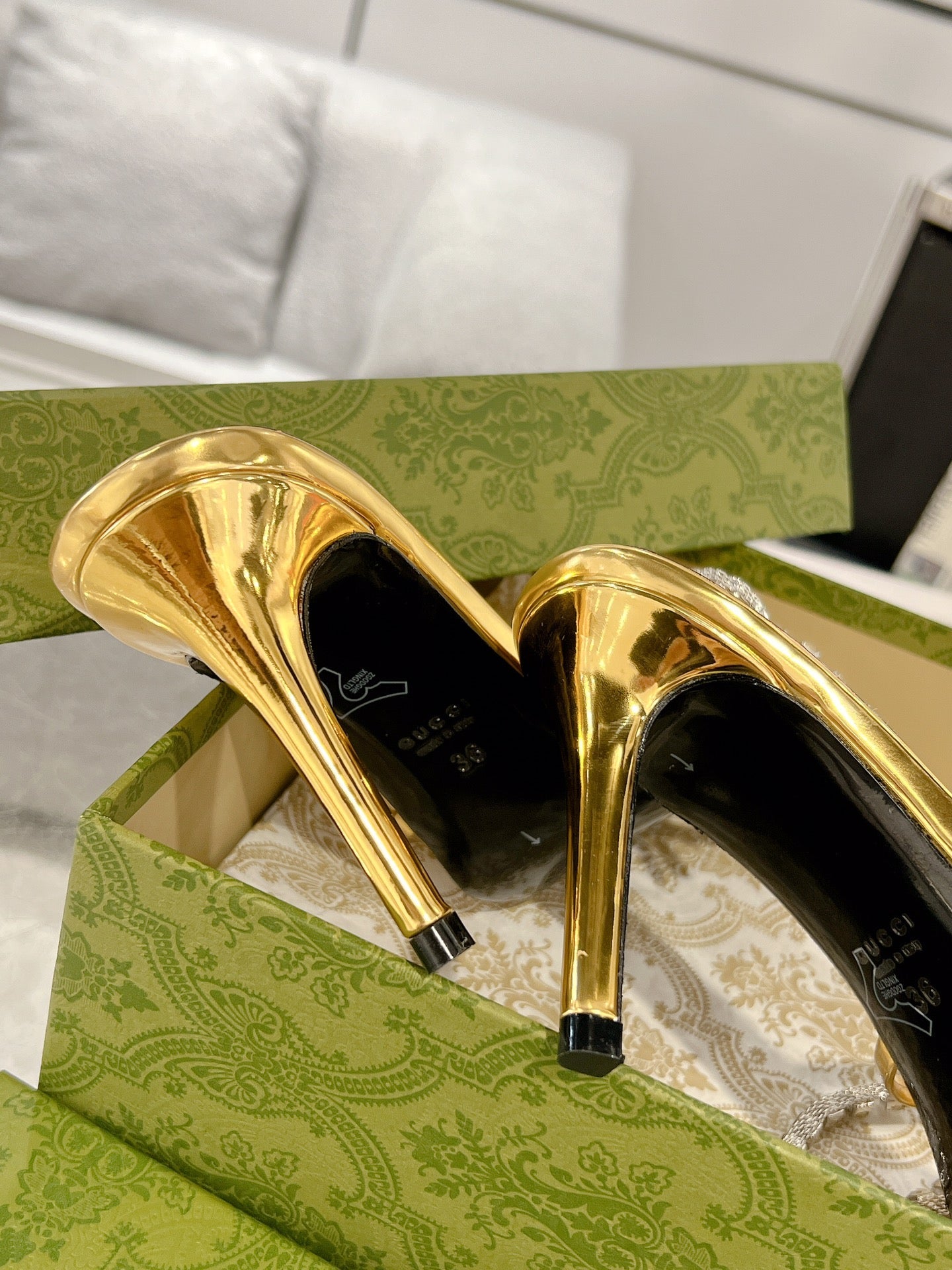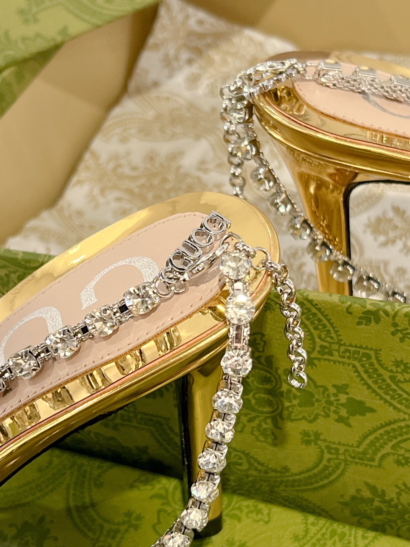 STRAPPY SANDAL WITH RHINESTONE CHAIN IN GOLD PATENT LEATHER