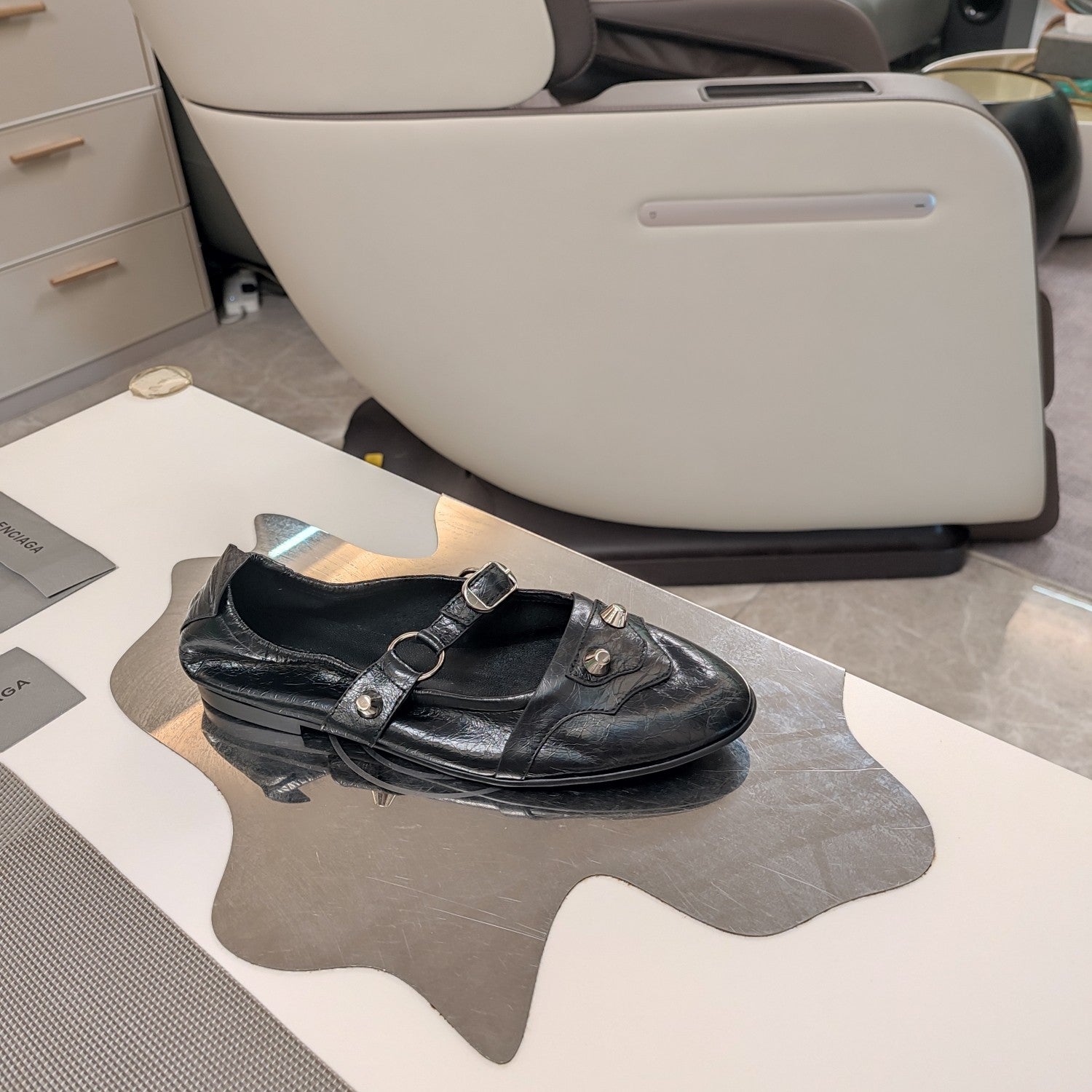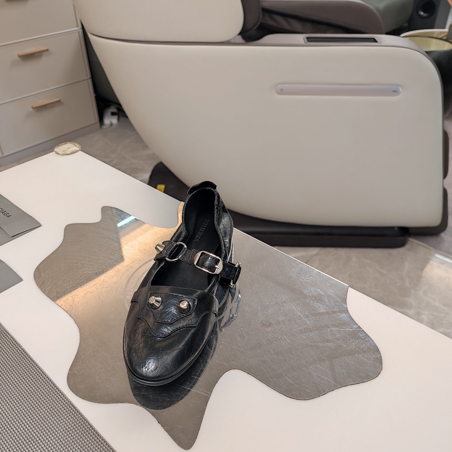 STUDDED MARY JANE FLATS IN BLACK SHINY LAMBSKIN