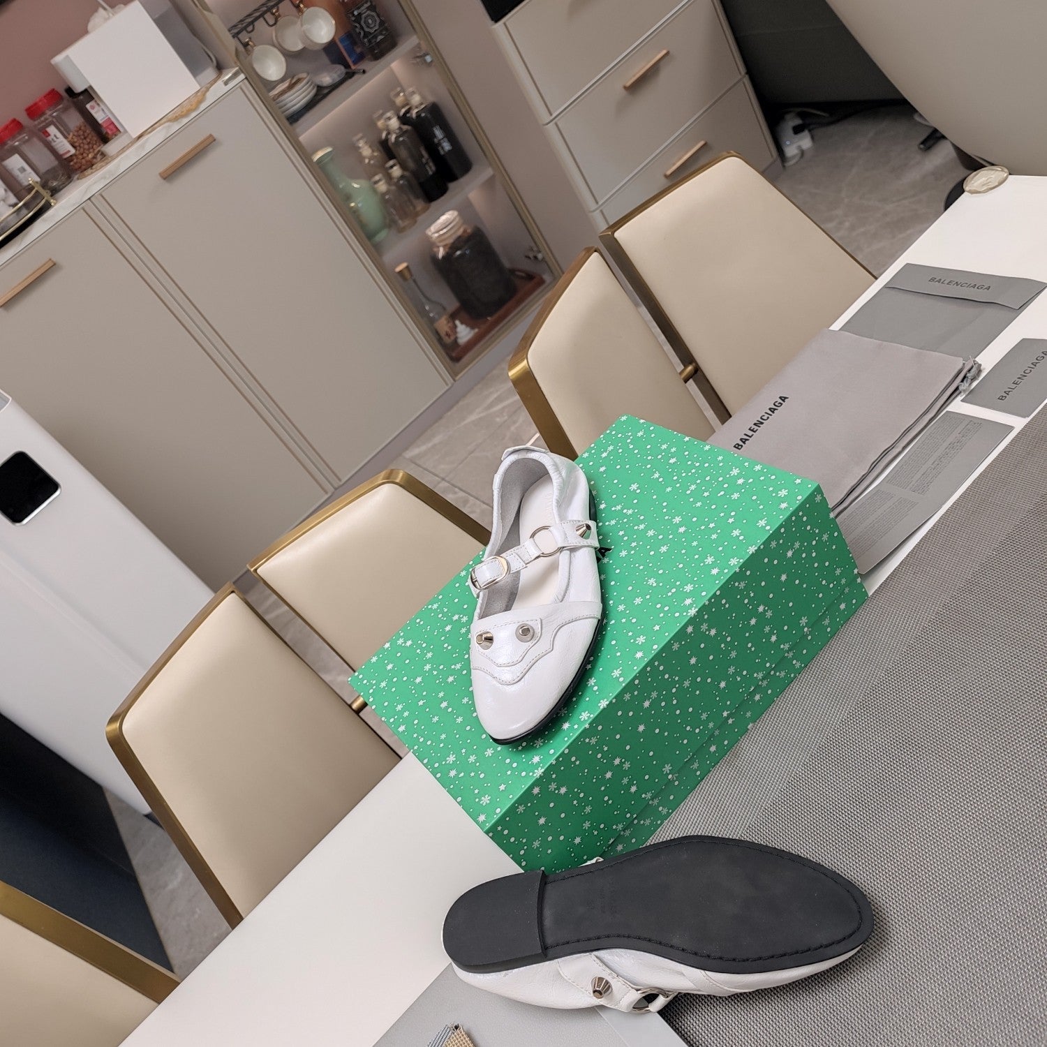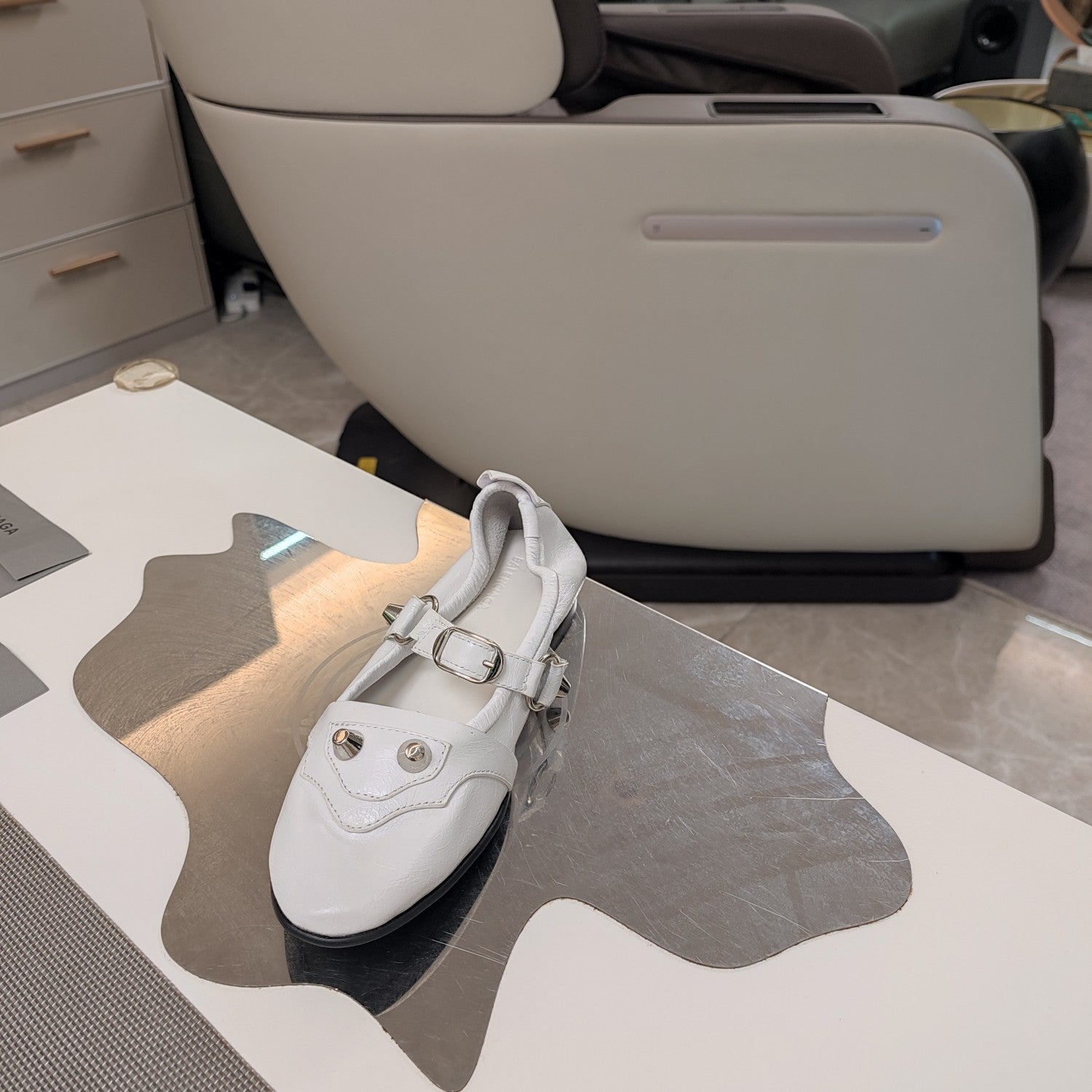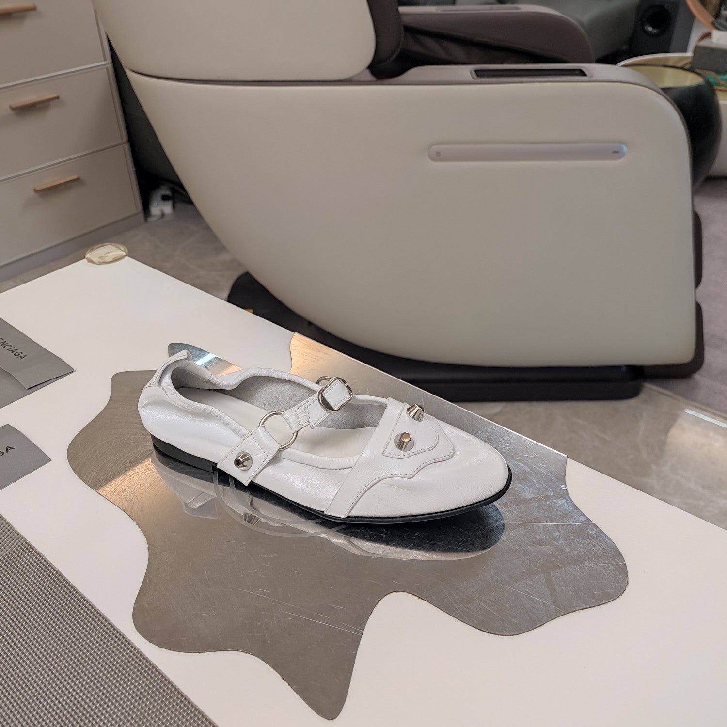 STUDDED MARY JANE FLATS IN WHITE SHINY LAMBSKIN