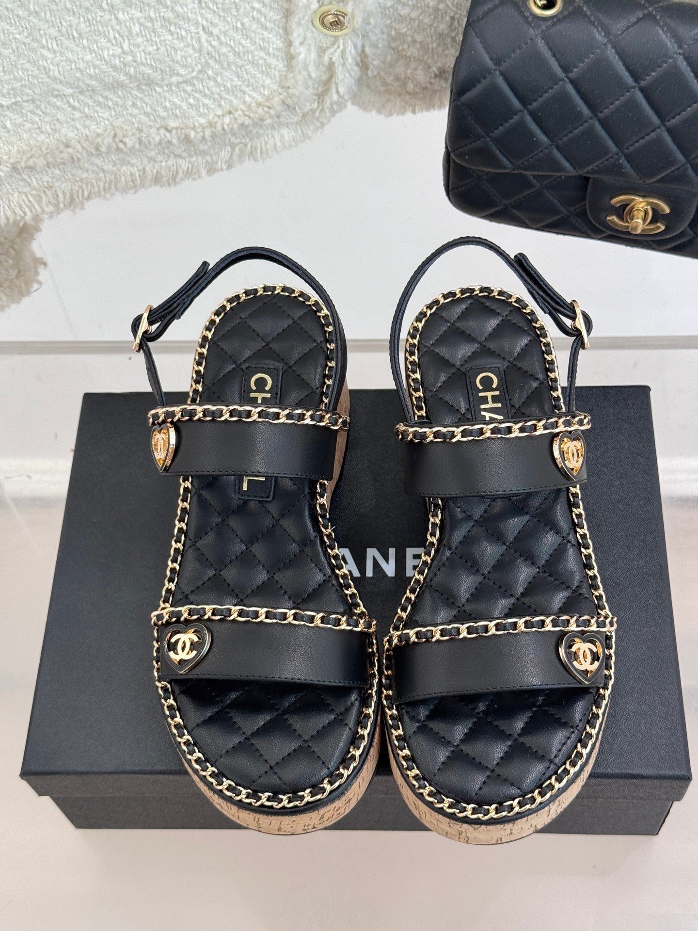 THICK-SOLED CHAIN HEART SANDAL IN BLACK LAMBSKIN