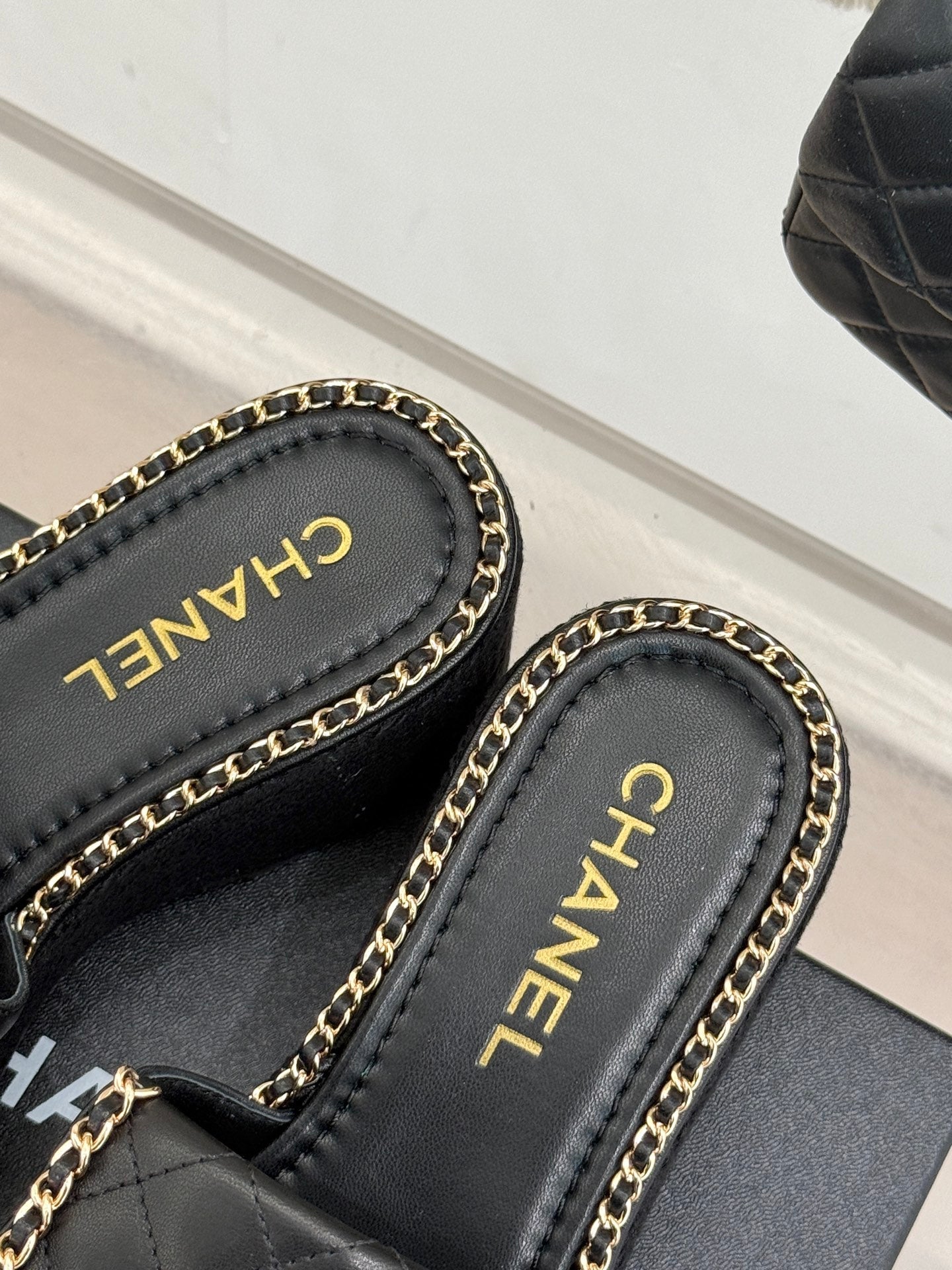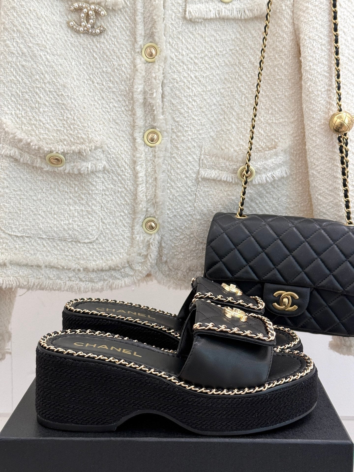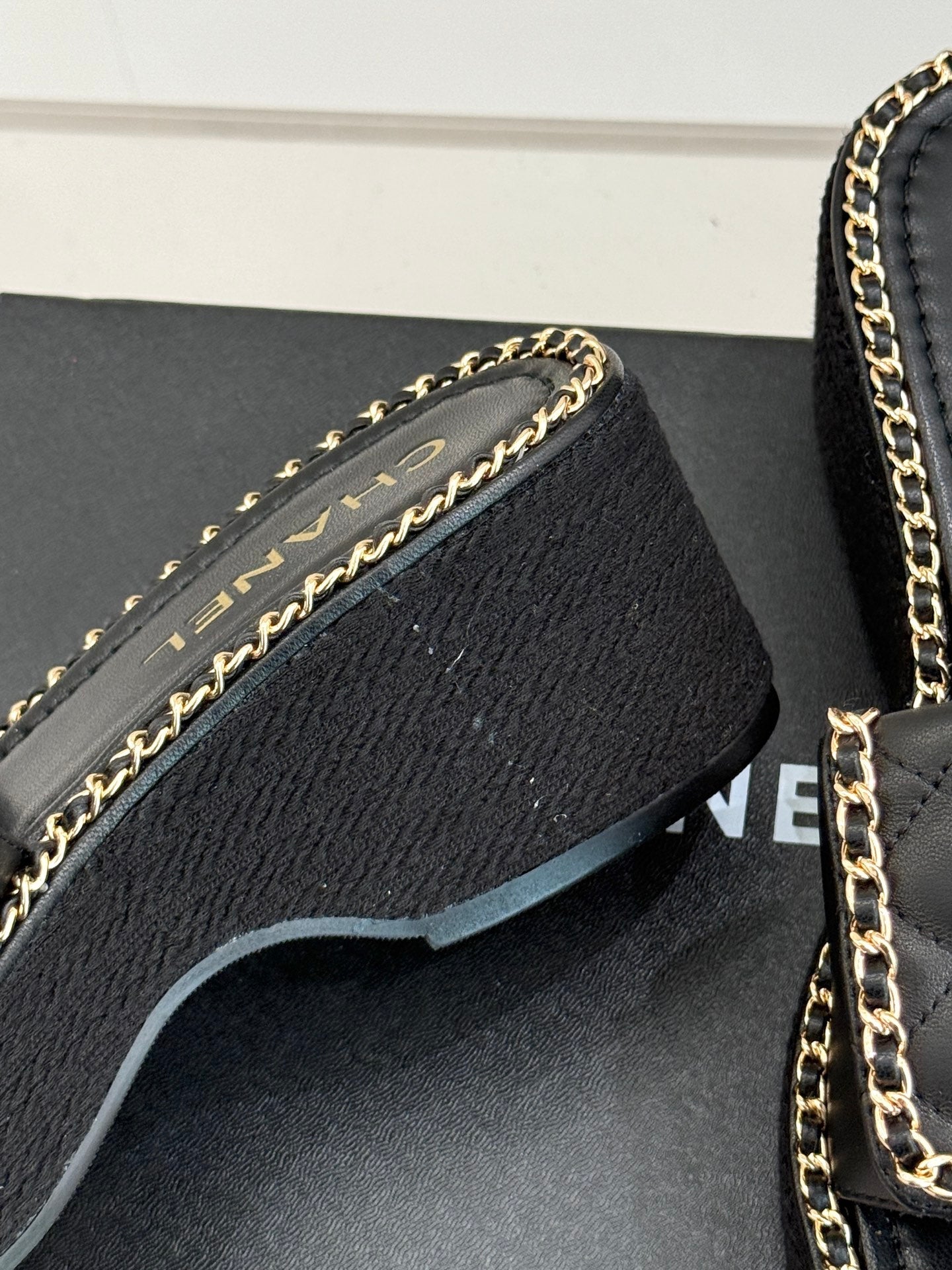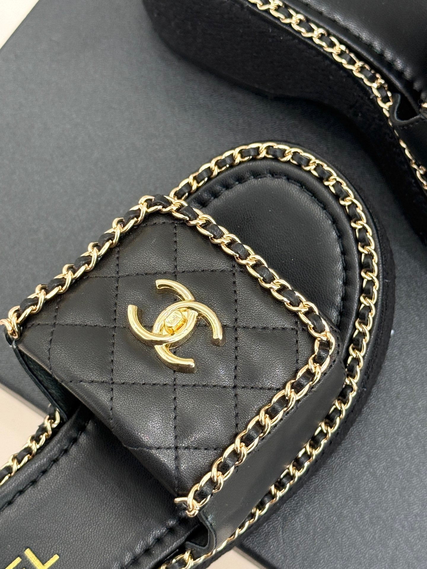 THICK-SOLED CHAIN HEART SLIPPER IN BLACK LAMBSKIN