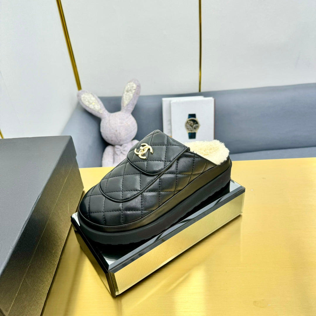 THICK-SOLED SLIDE IN BLACK LAMBSKIN AND WOOL LINING