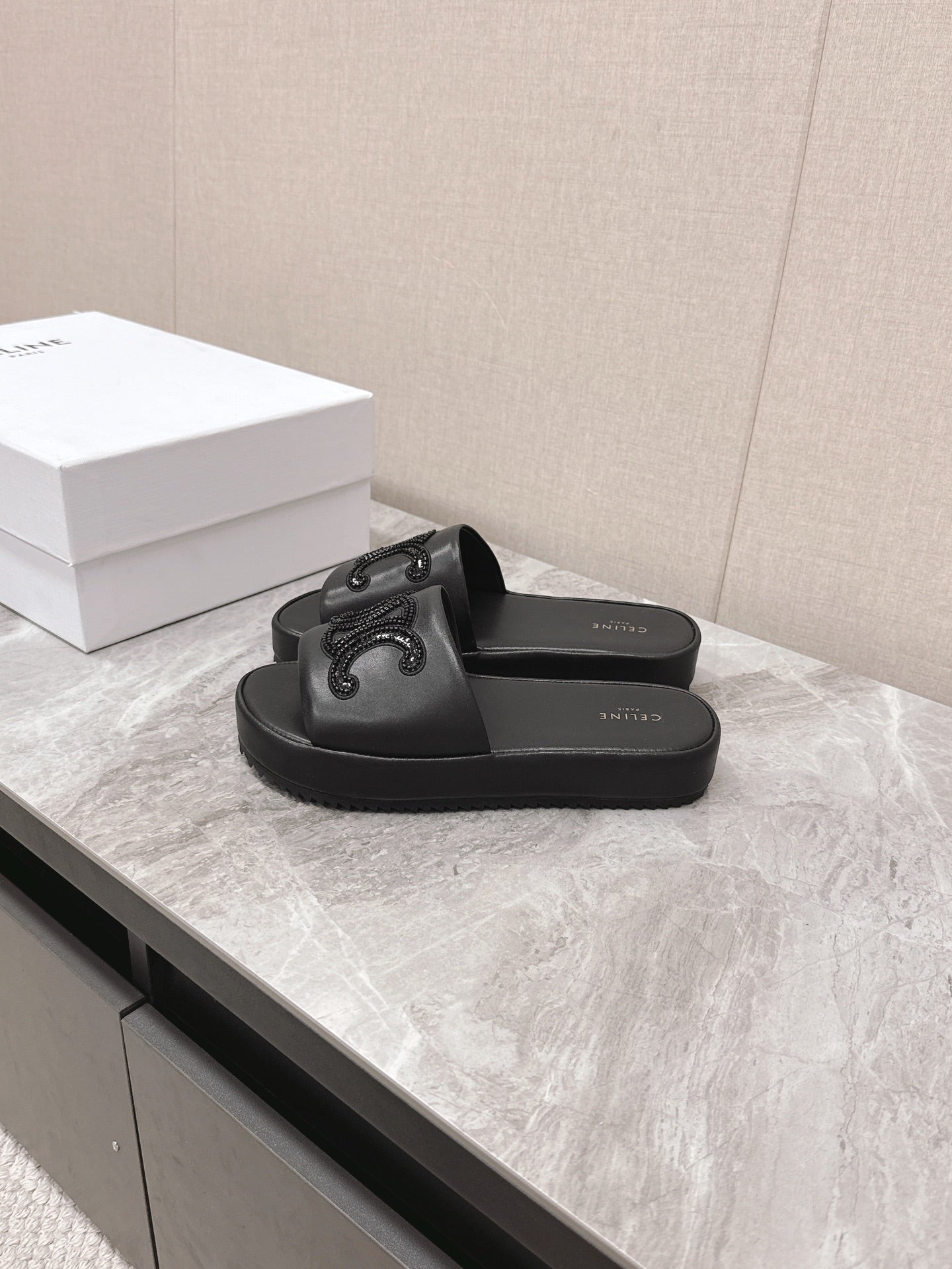 THICK-SOLED SLIDES IN BLACK SMOOTH LAMBSKIN LOGO WITH CRYSTALS