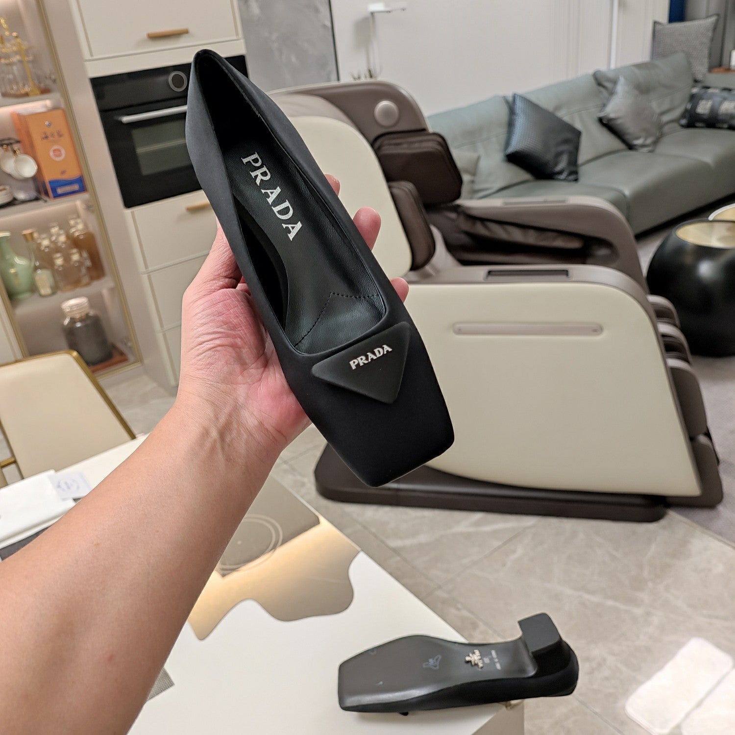 TRIANGLE LOGO PUMPS IN BLACK SATIN