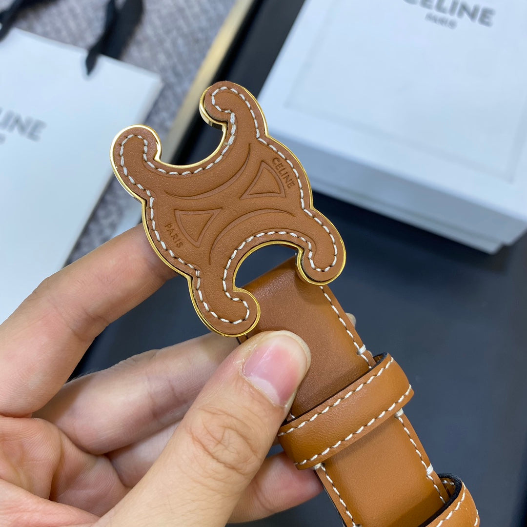 TRIOMPHE BELT 25MM IN BROWN CALFSKIN WITH LEATHER-COVERED BUCKLE AND WHITE STITCHING