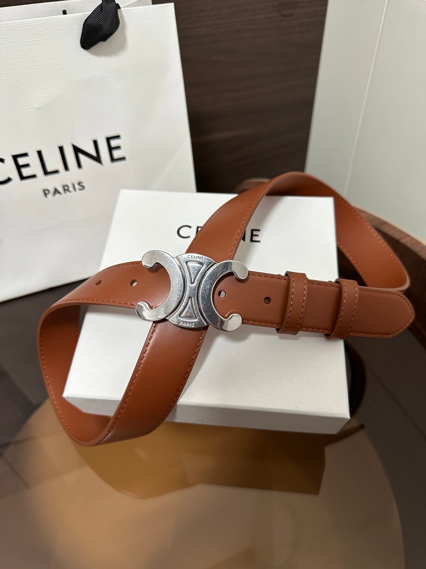 TRIOMPHE BELT 30MM IN BROWN CALFSKIN WITH SILVER BUCKLE