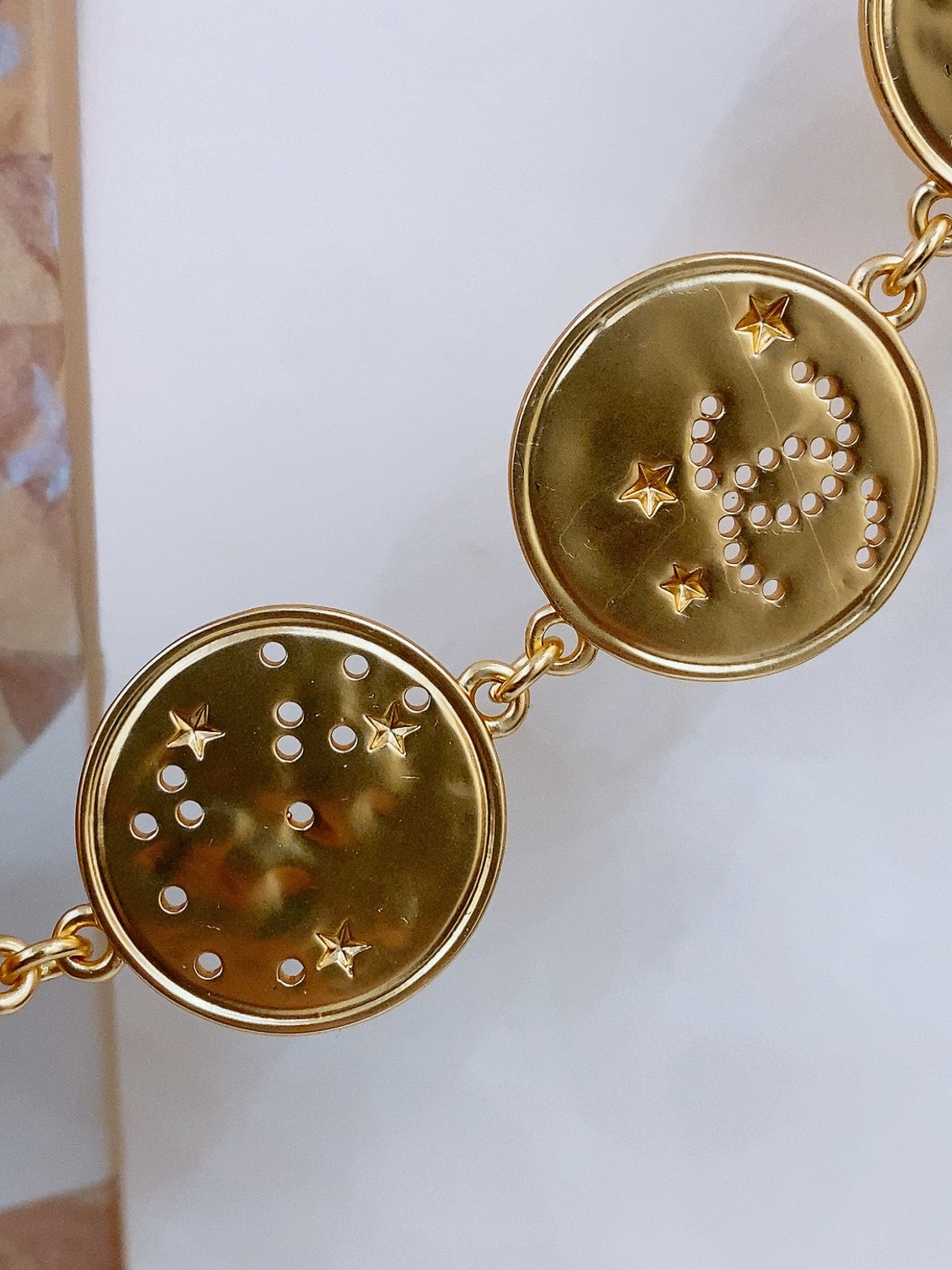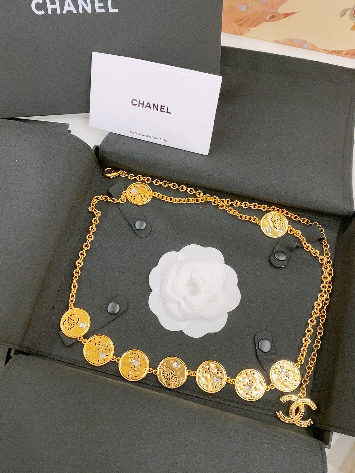 TWISTED CHAIN BELT WITH RHINESTONES AND LOGO PLATE IN GOLD TONE