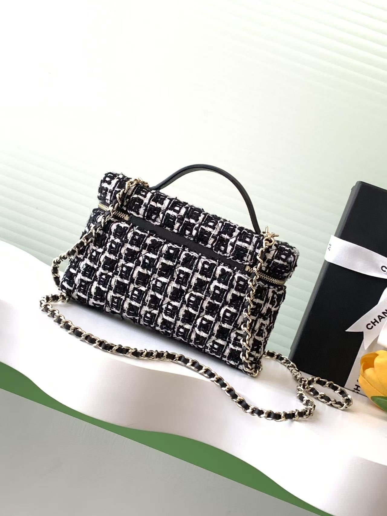 VANITY CASE 19 IN BLACK MIX WHITE QUILTED TWEED GOLD HARDWARE