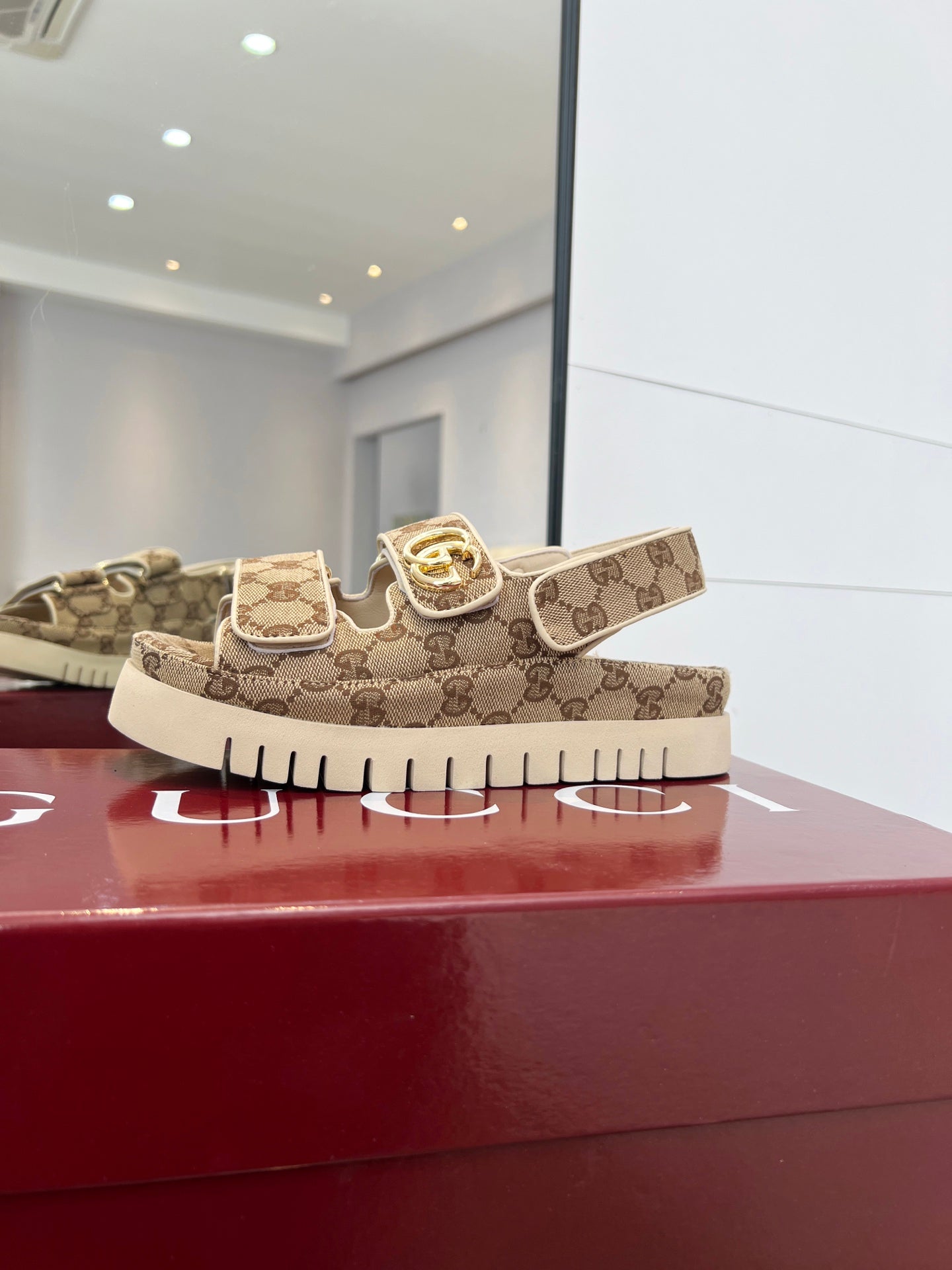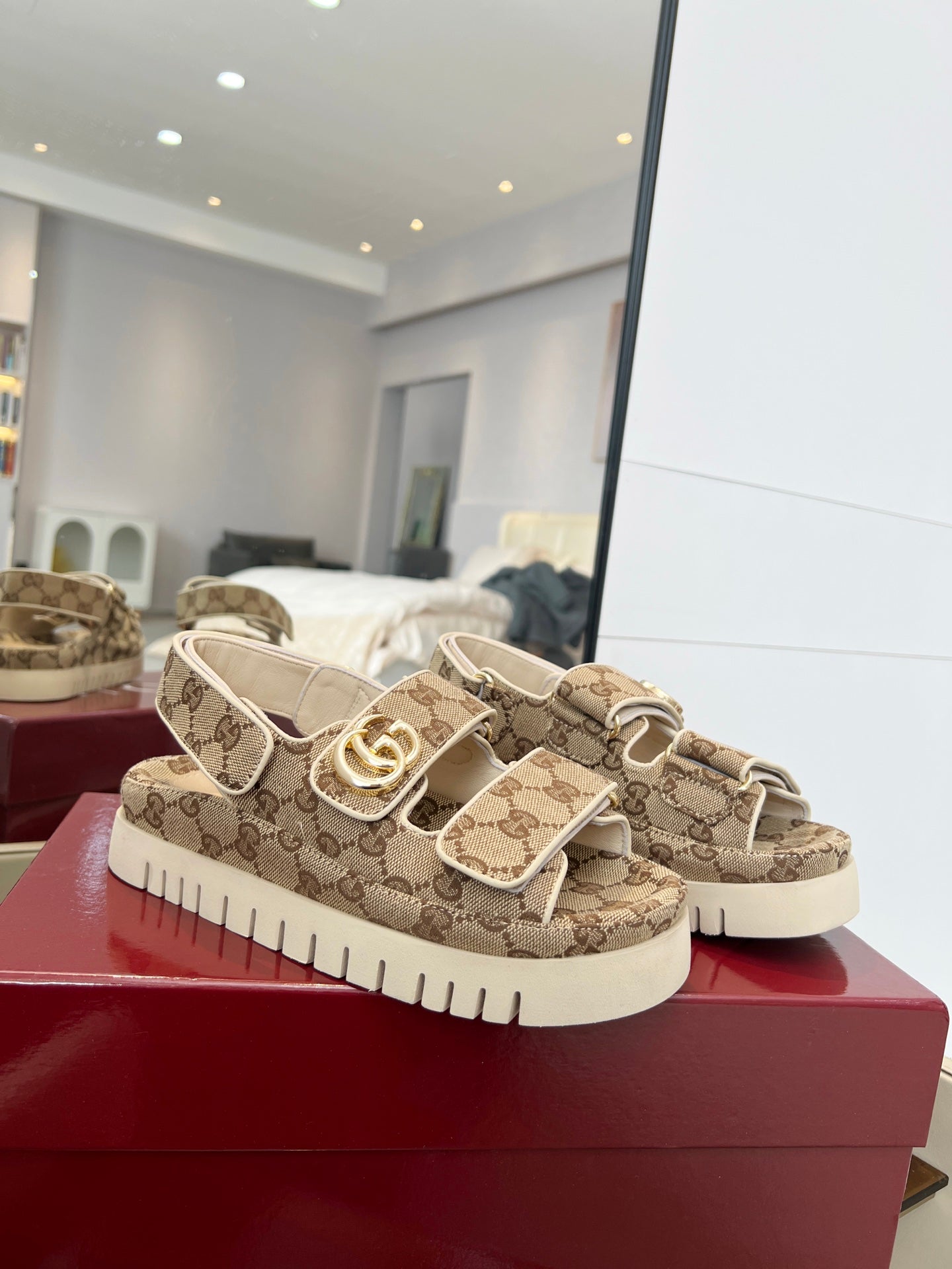 VELCRO STRAP SANDALS IN BEIGE AND DARK BROWN MONOGRAM CANVAS GOLD HARDWARE