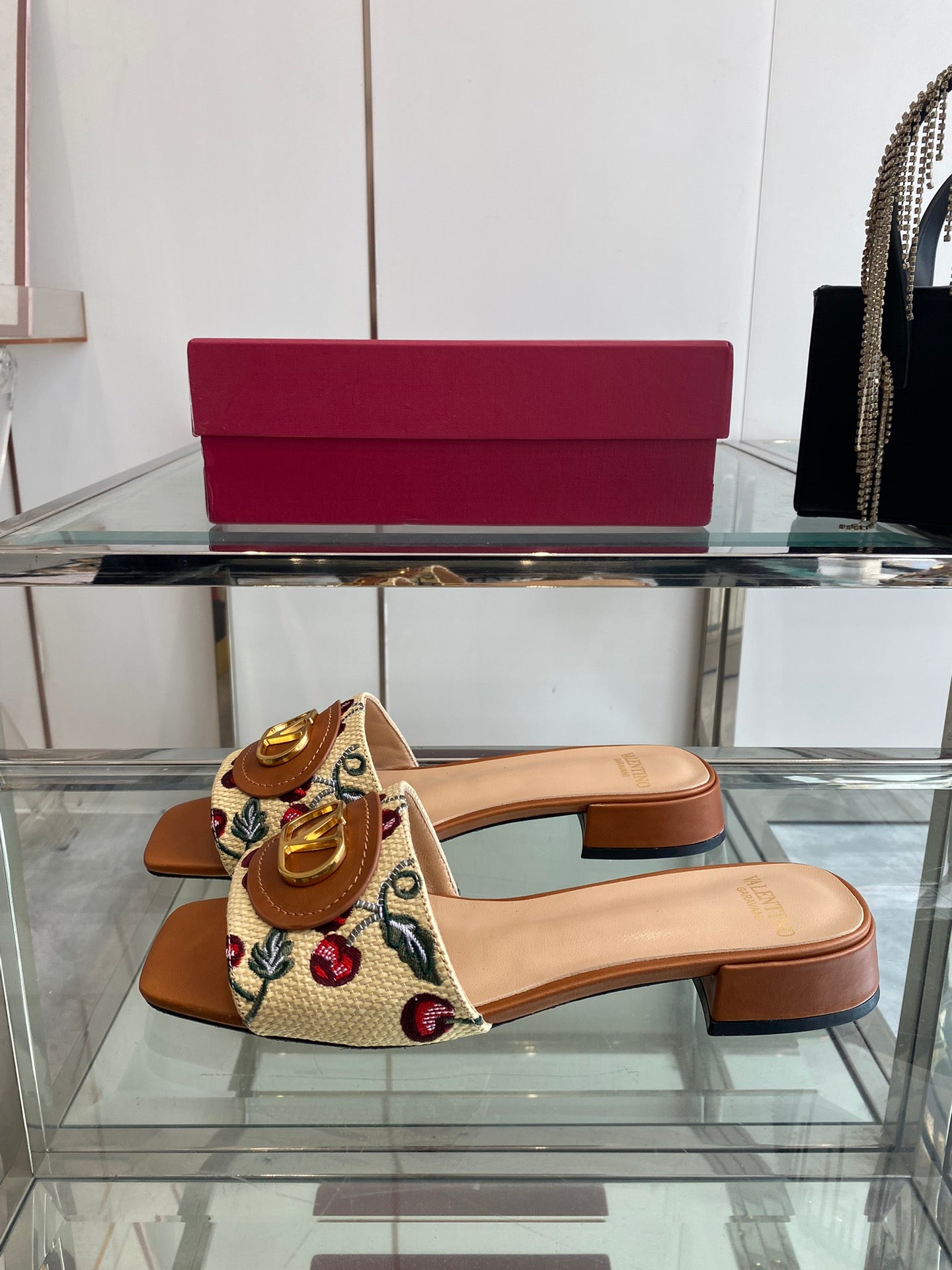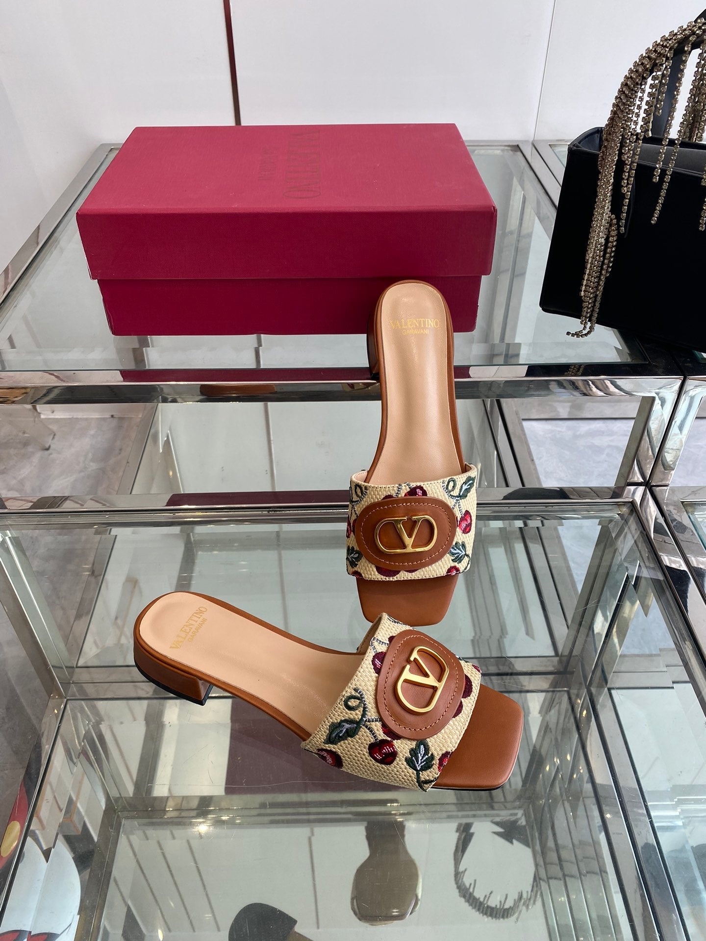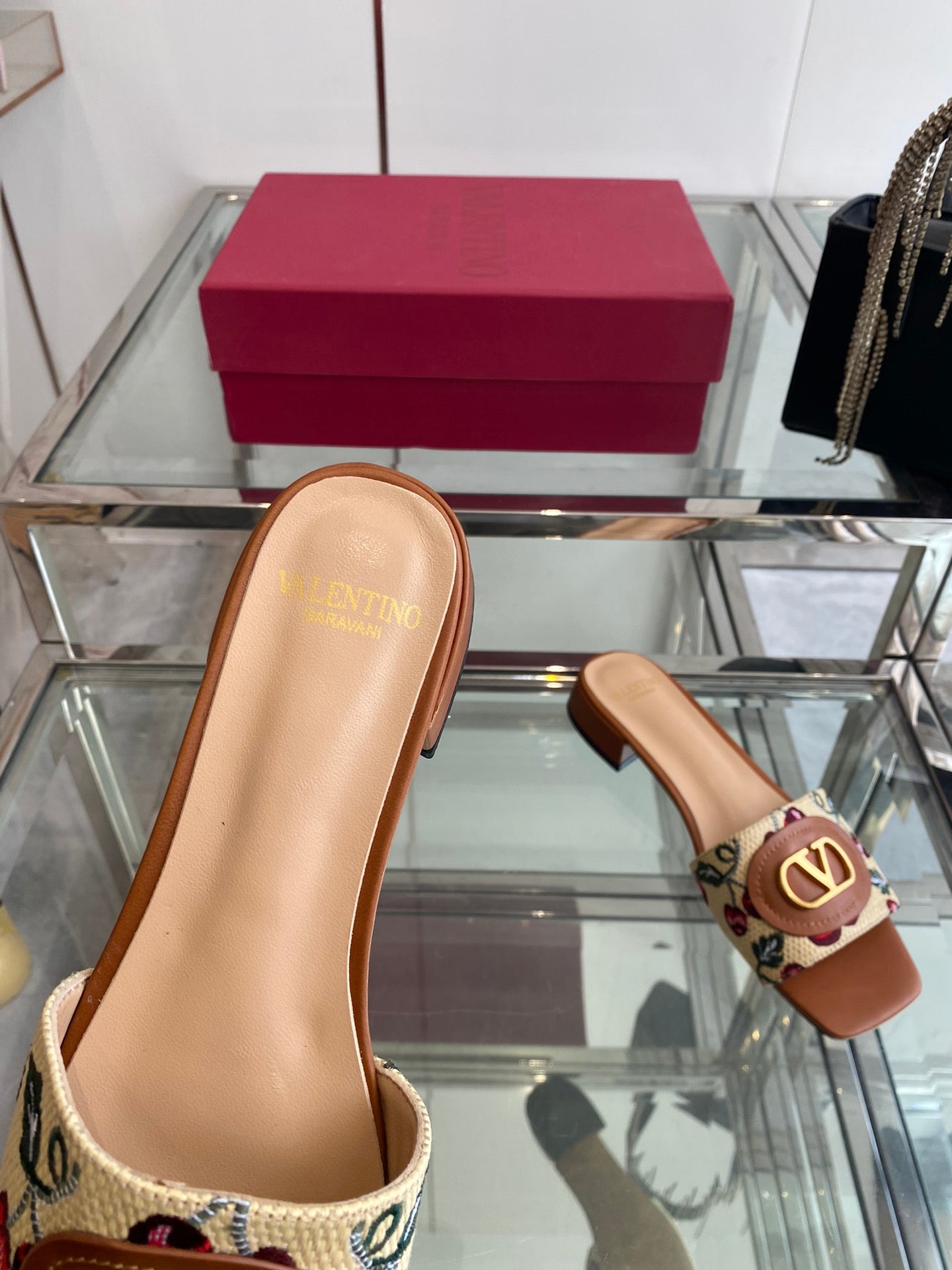 VLTN HIGH HEEL 25S 30 MM IN BEIGE FABRIC AND BROWN LAMBSKIN WITH EMBROIDERED CHERRY MOTIF