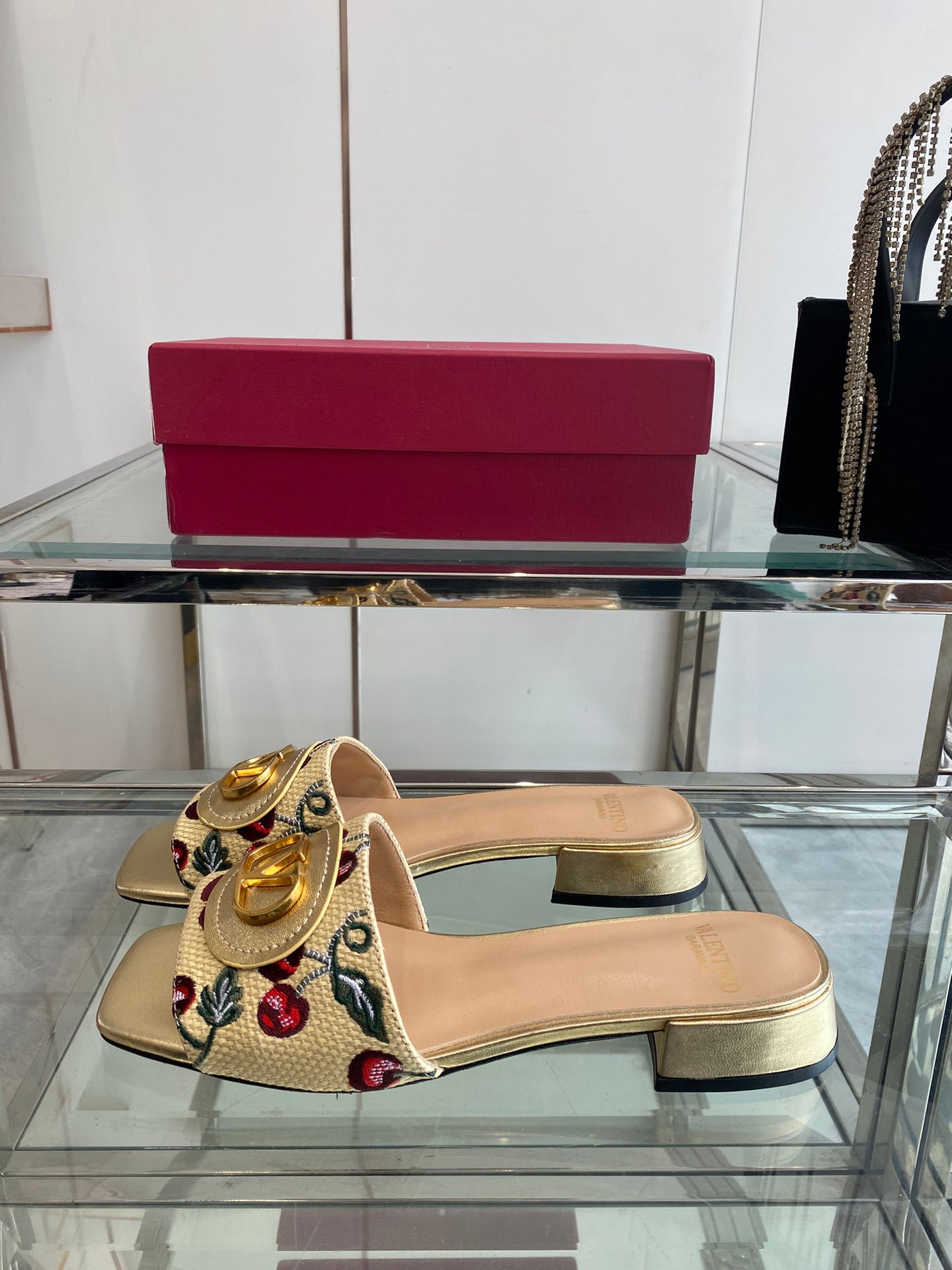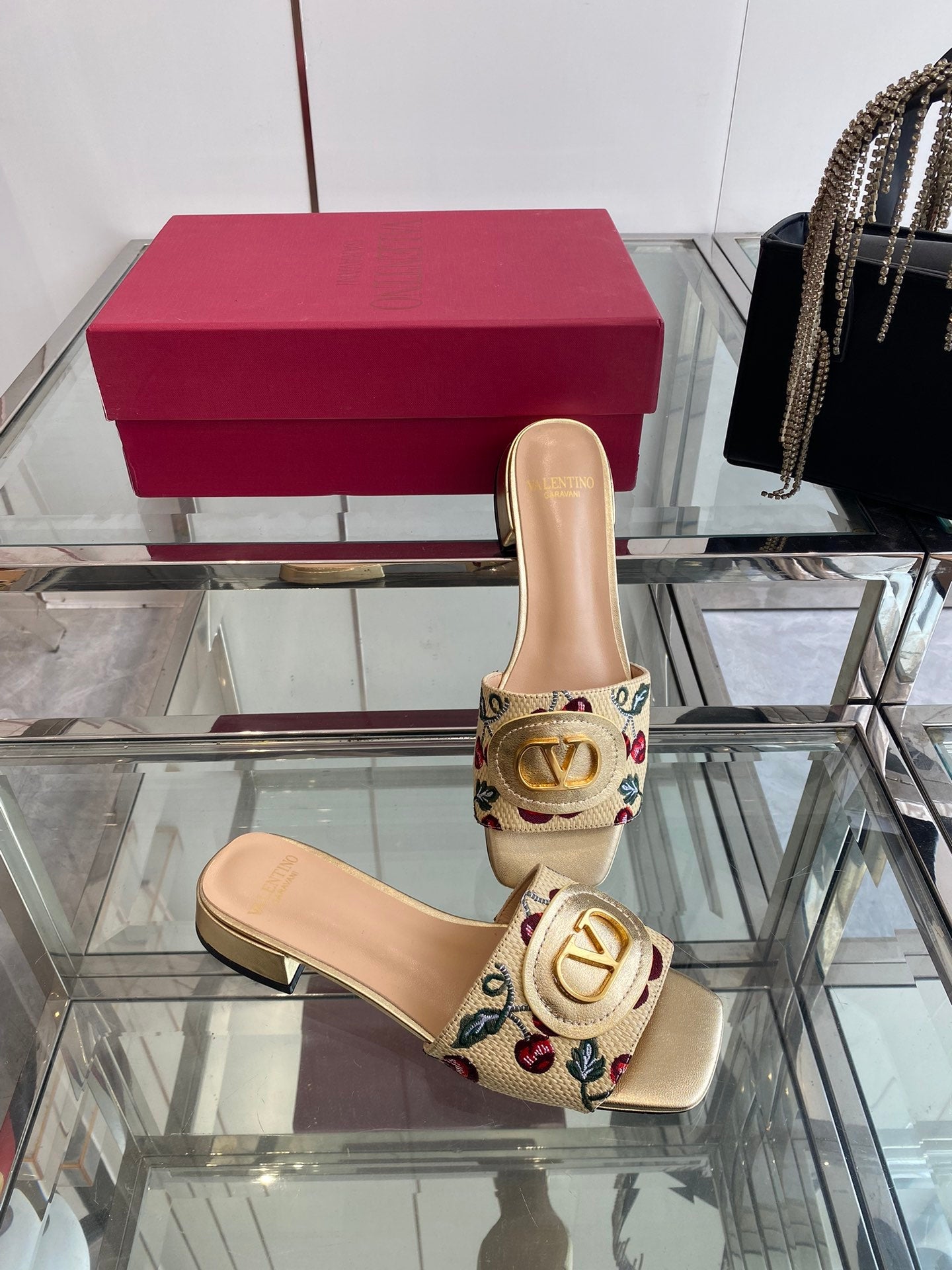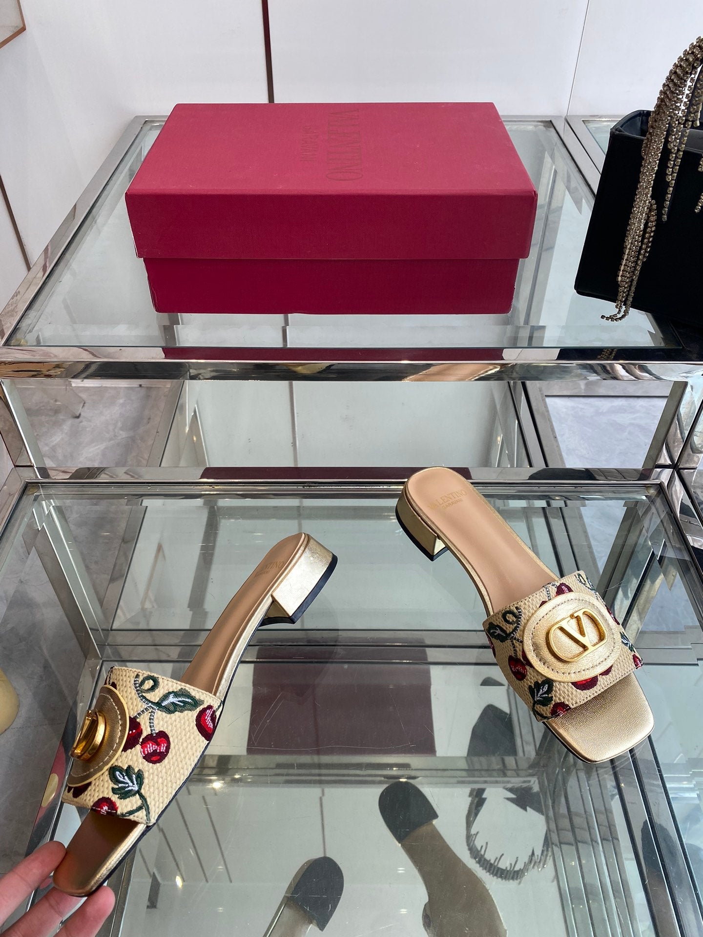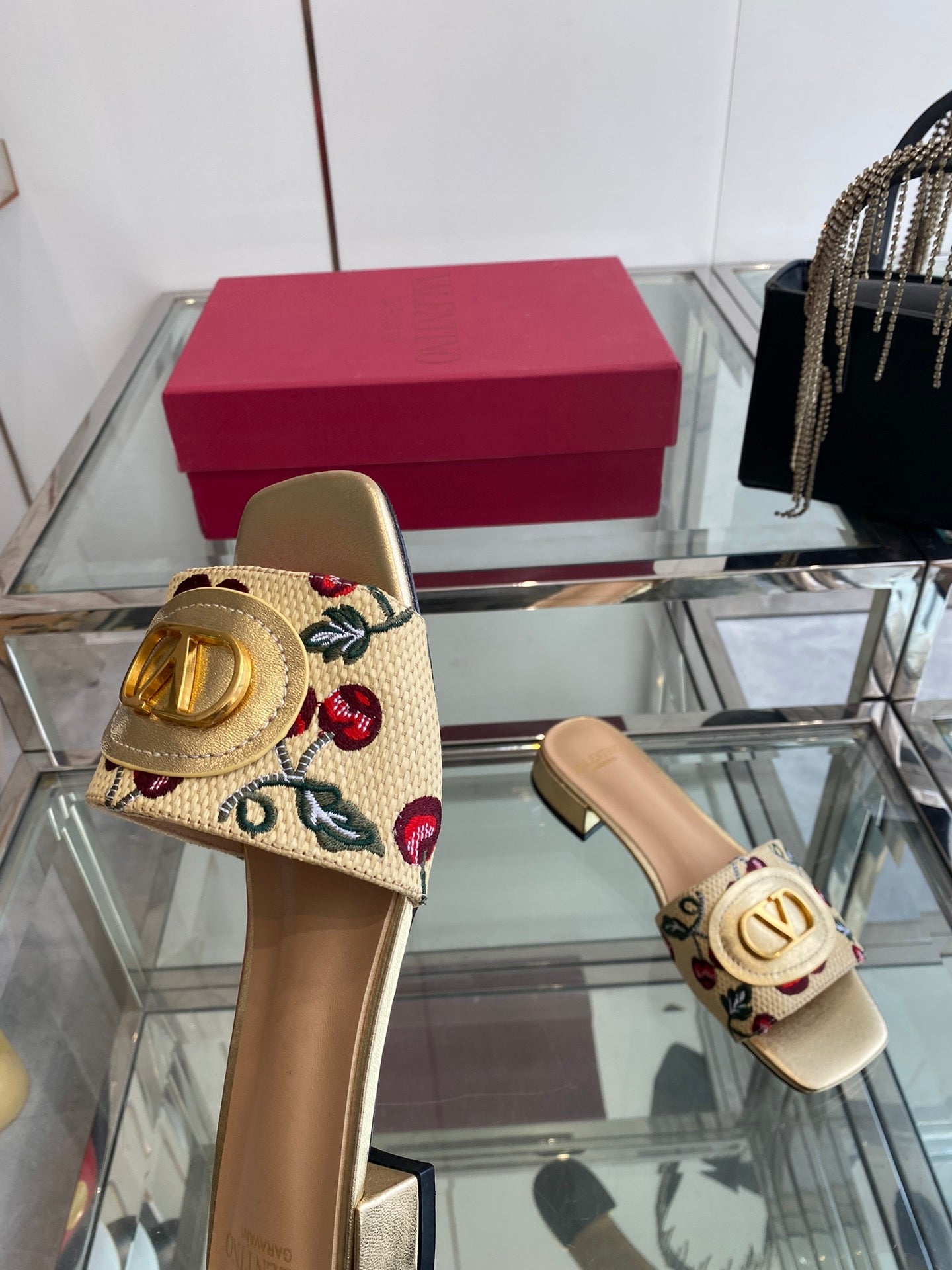 VLTN HIGH HEEL 25S 30 MM IN BEIGE FABRIC AND GOLD LAMBSKIN WITH EMBROIDERED CHERRY MOTIF