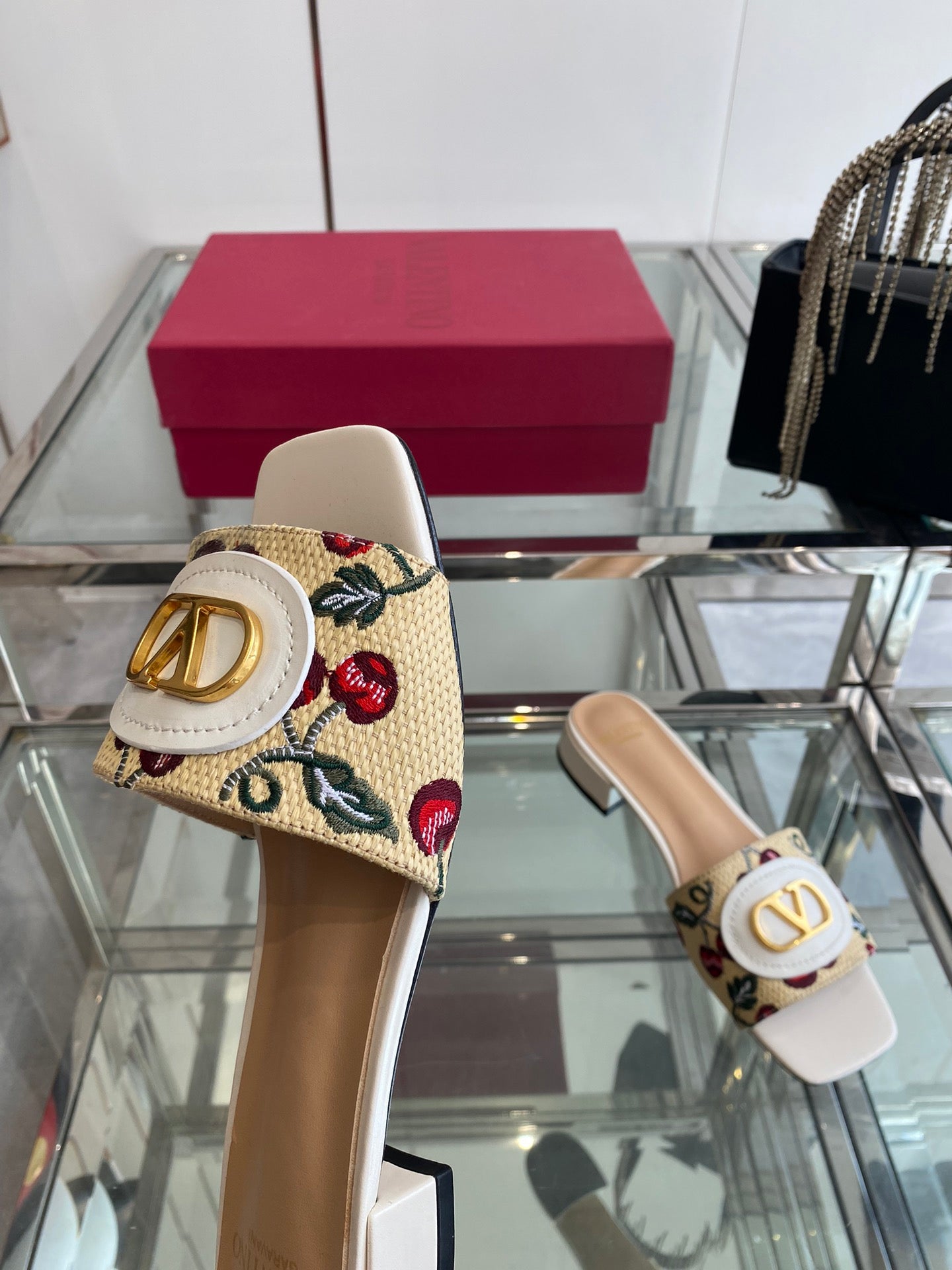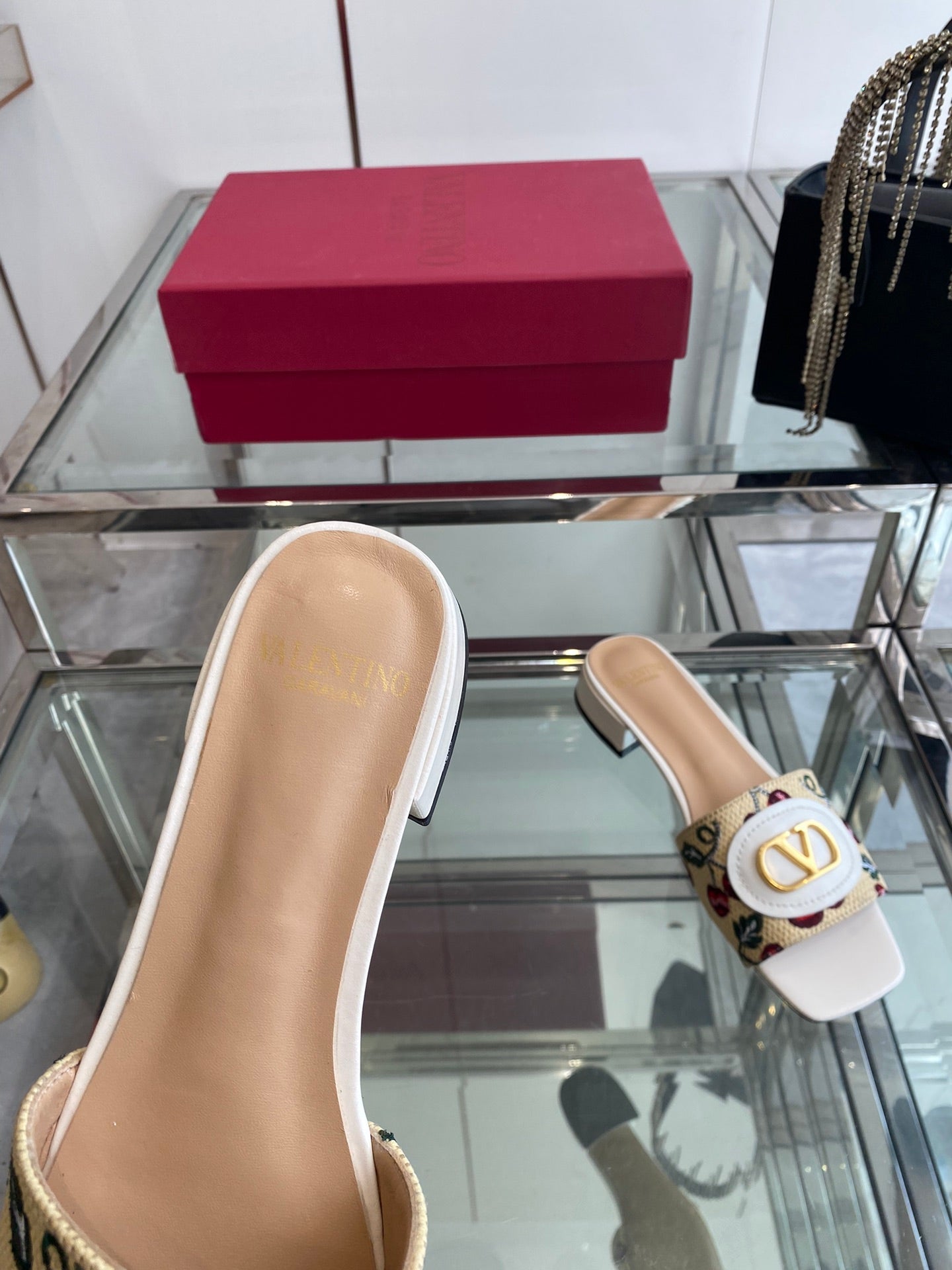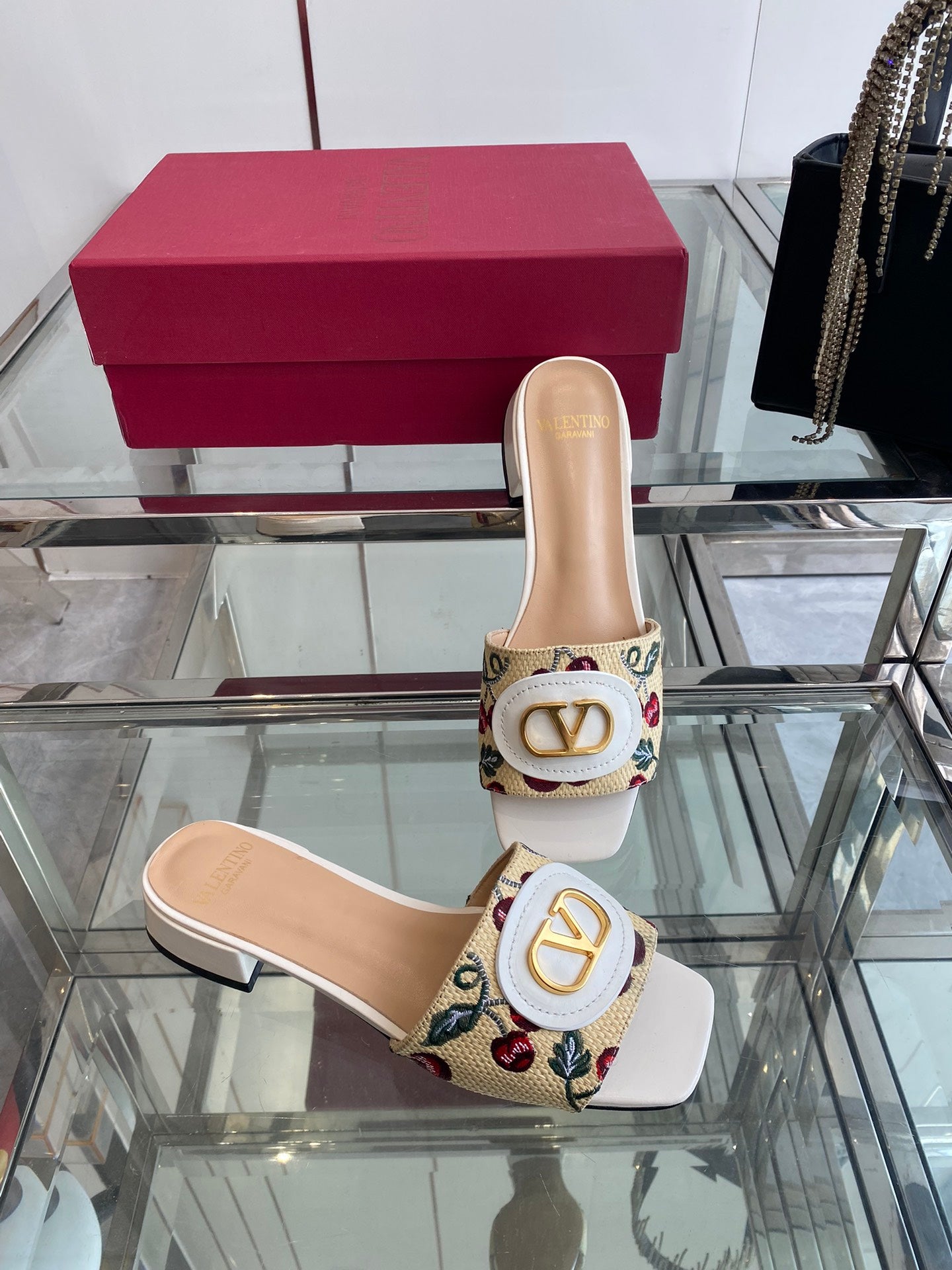 VLTN HIGH HEEL 25S 30 MM IN BEIGE FABRIC AND WHITE LAMBSKIN WITH EMBROIDERED CHERRY MOTIF