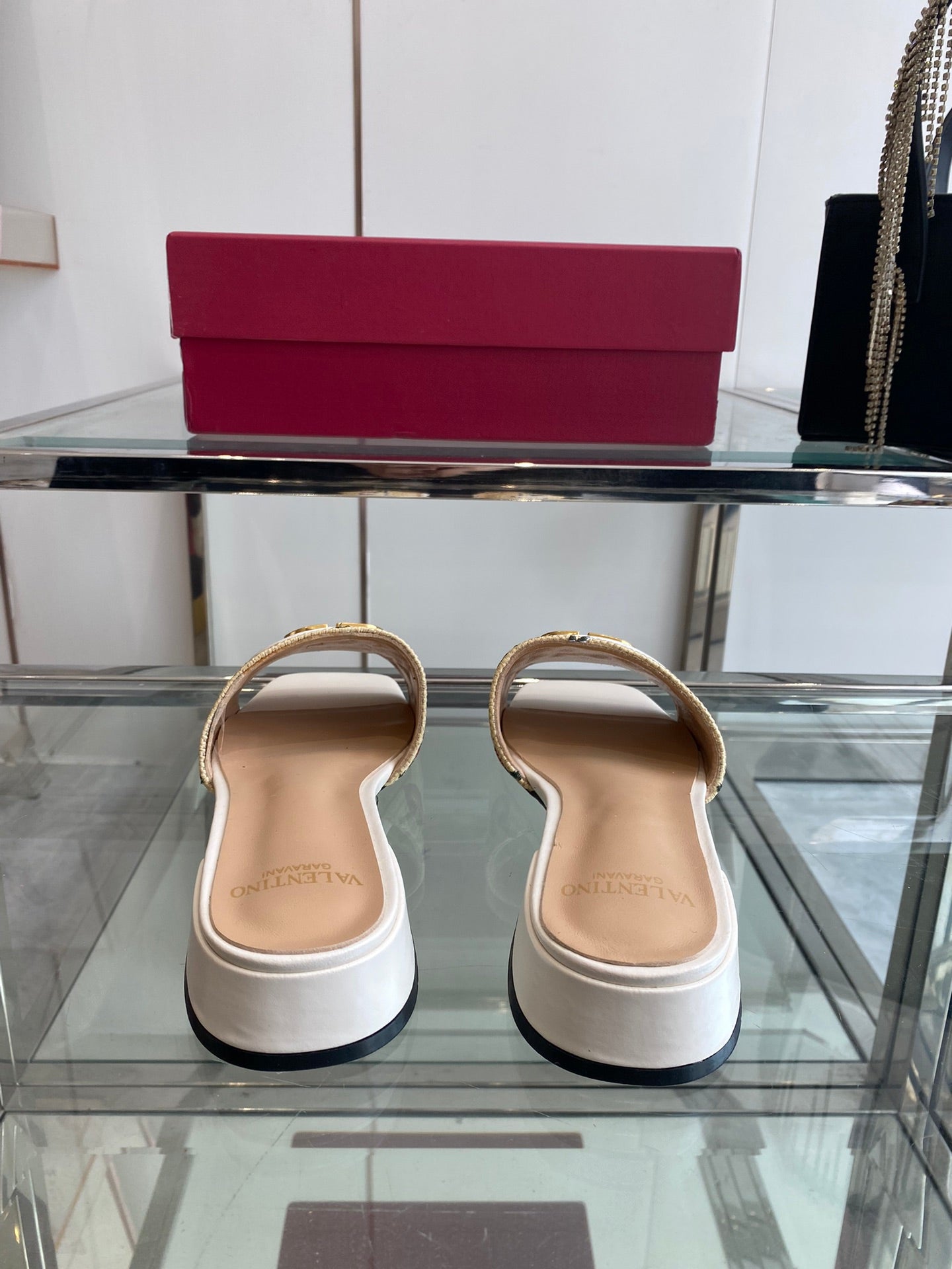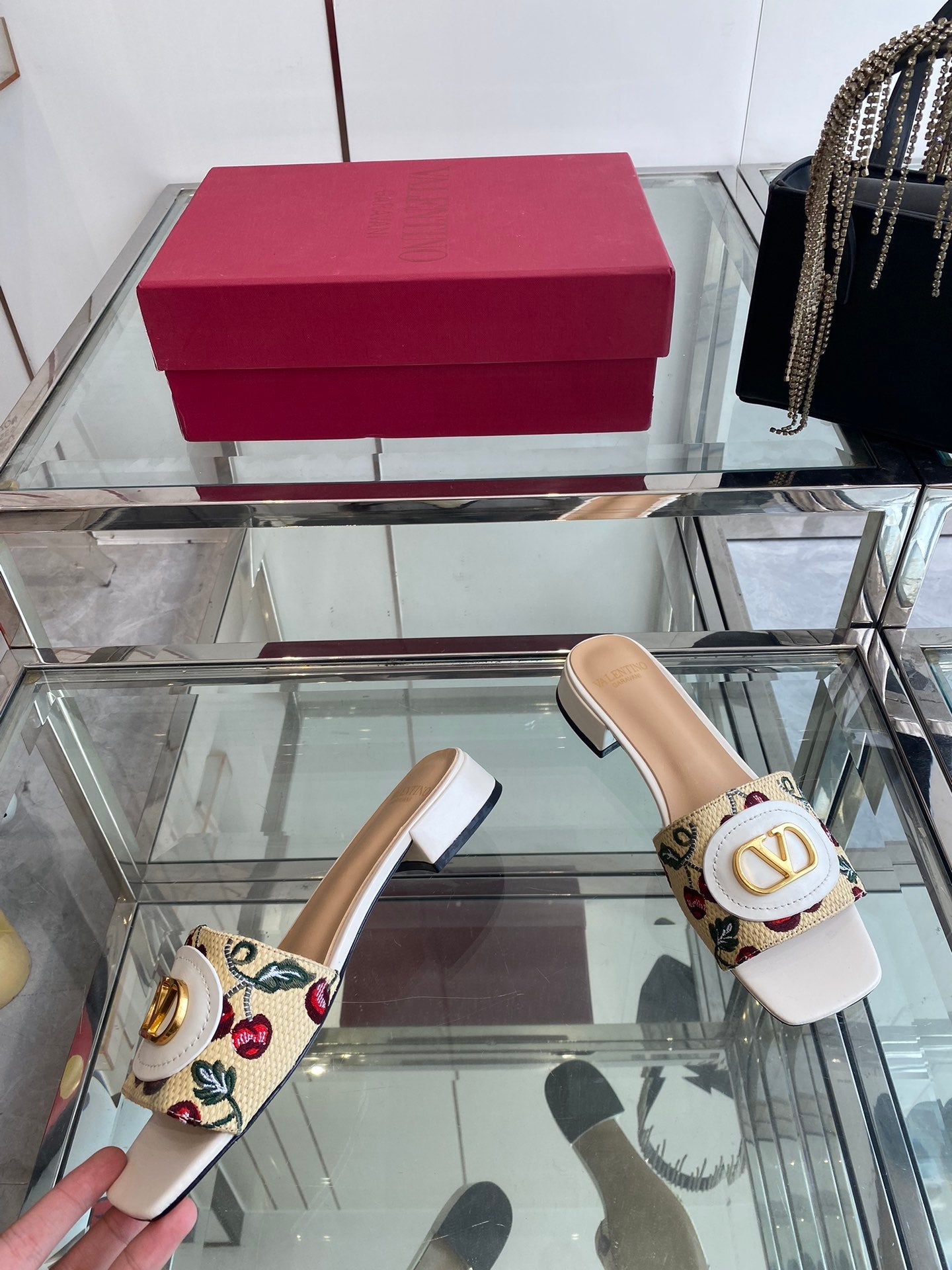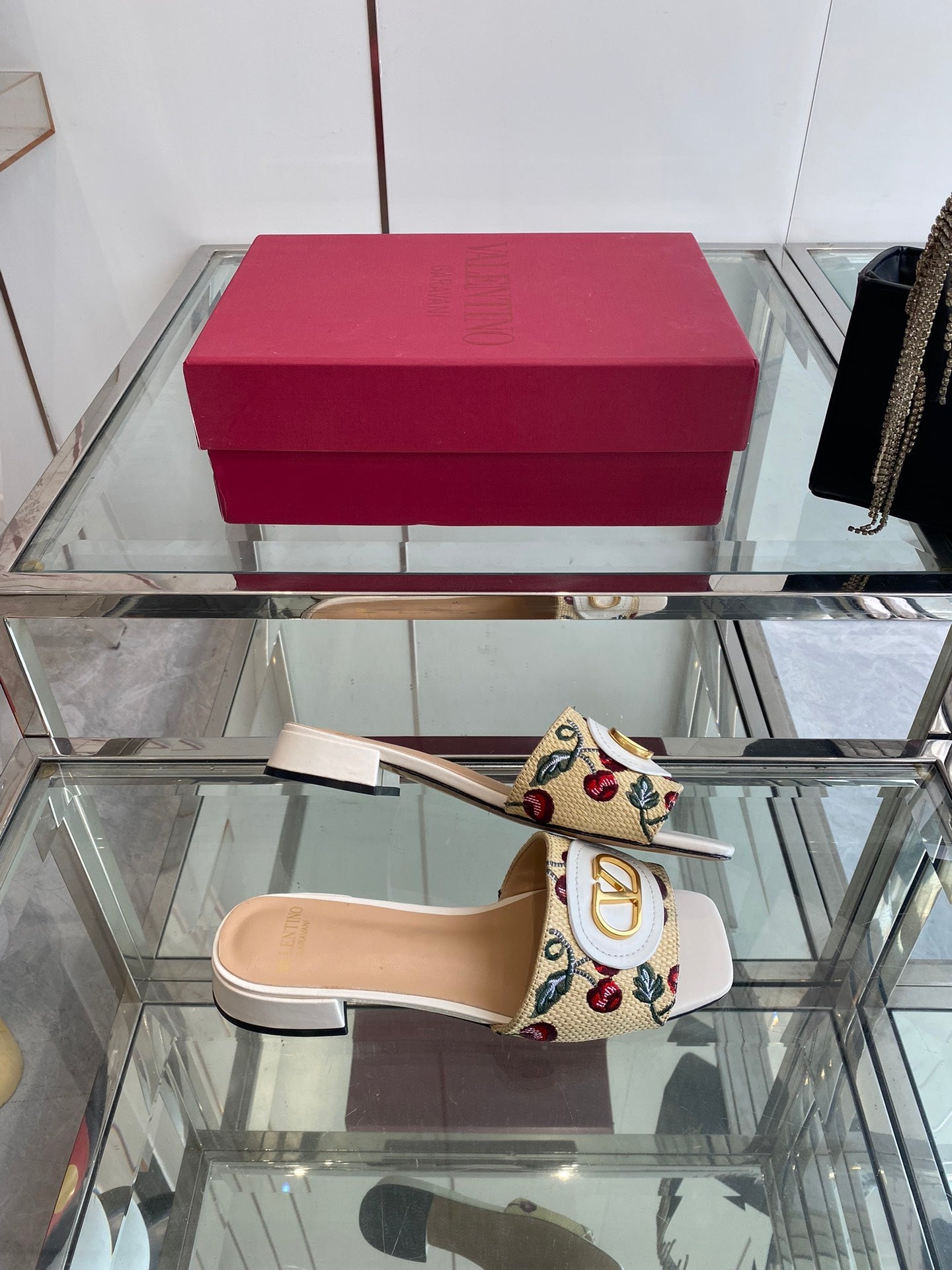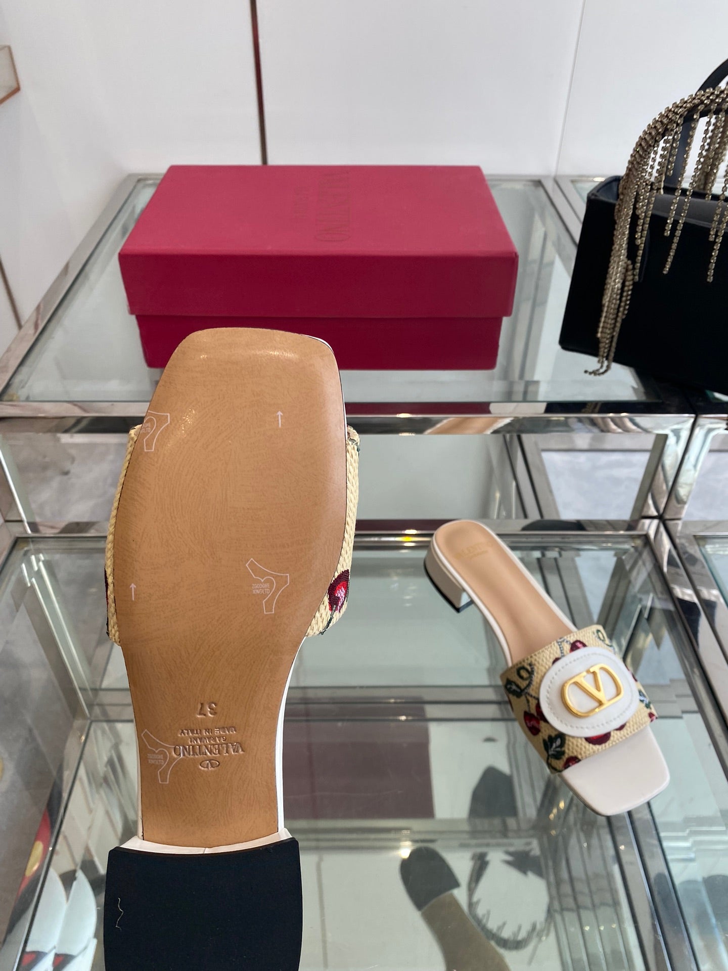 VLTN HIGH HEEL 25S 30 MM IN BEIGE FABRIC AND WHITE LAMBSKIN WITH EMBROIDERED CHERRY MOTIF