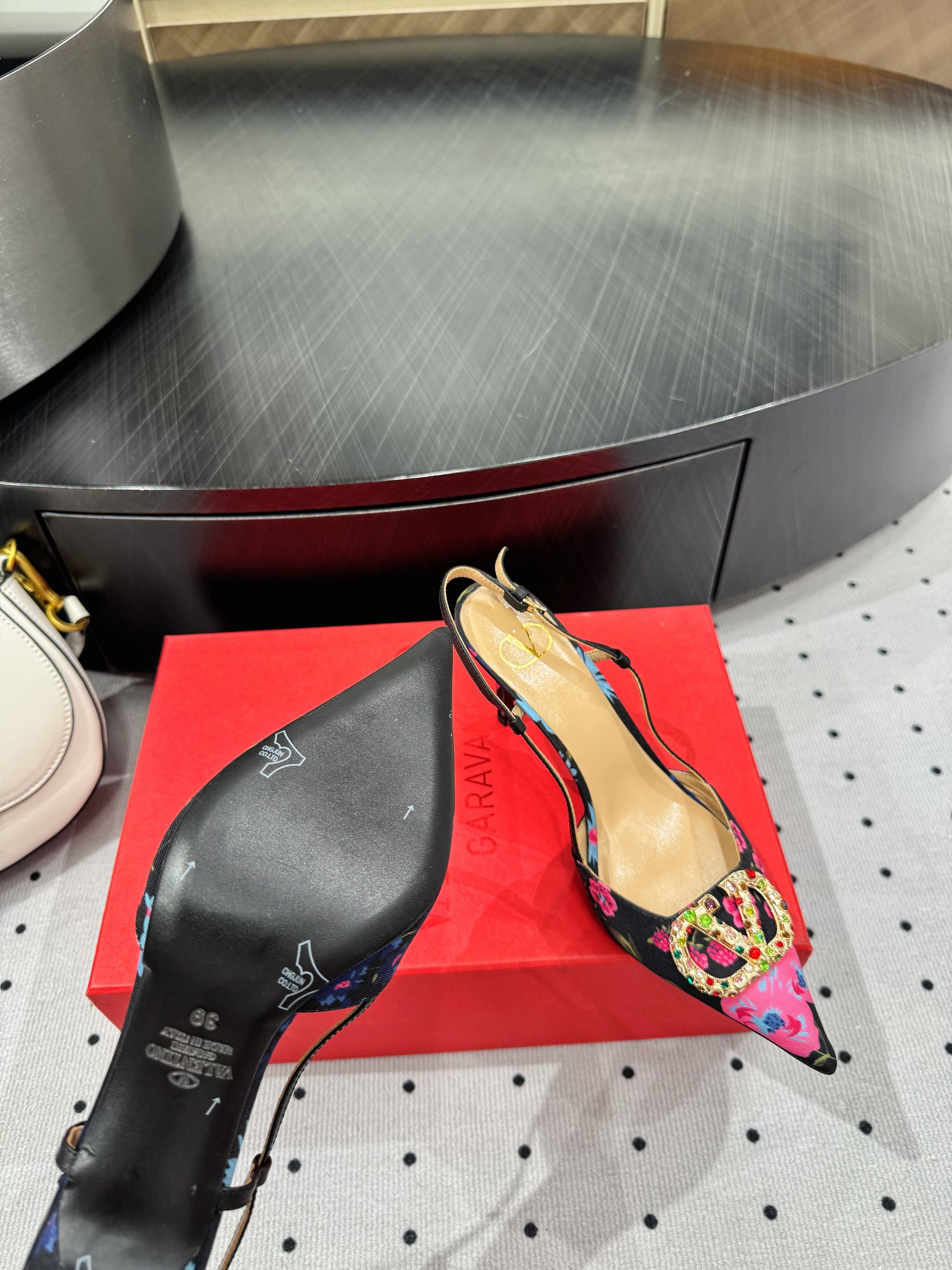 VLTN HIGH SLINGBACK 25S 80 MM IN BLACK MIX PINK FABRIC AND CALFSKIN