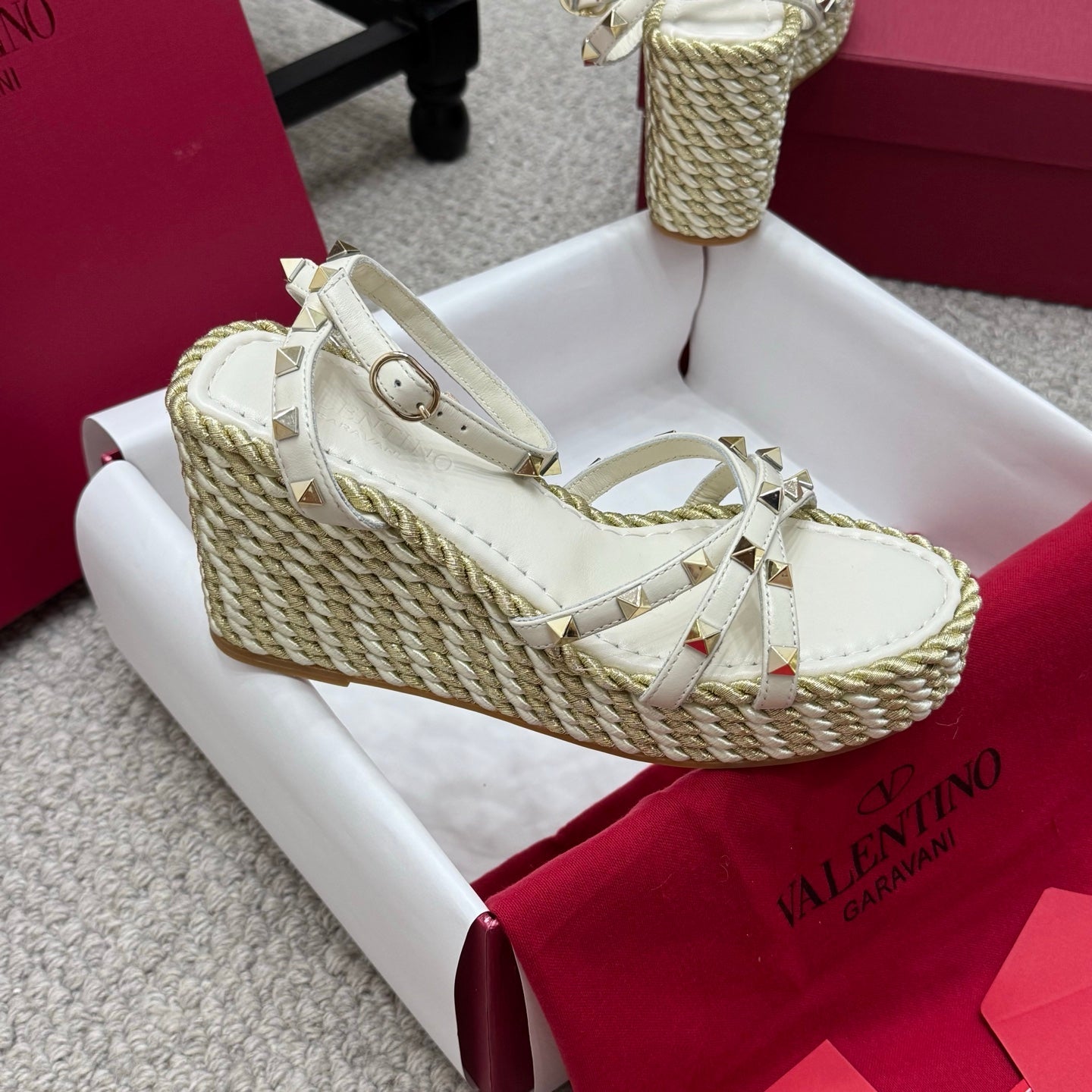 VLTN HIGH WEDGE STUDDED SANDALS 25S 100 MM IN CREAM WHITE CALFSKIN