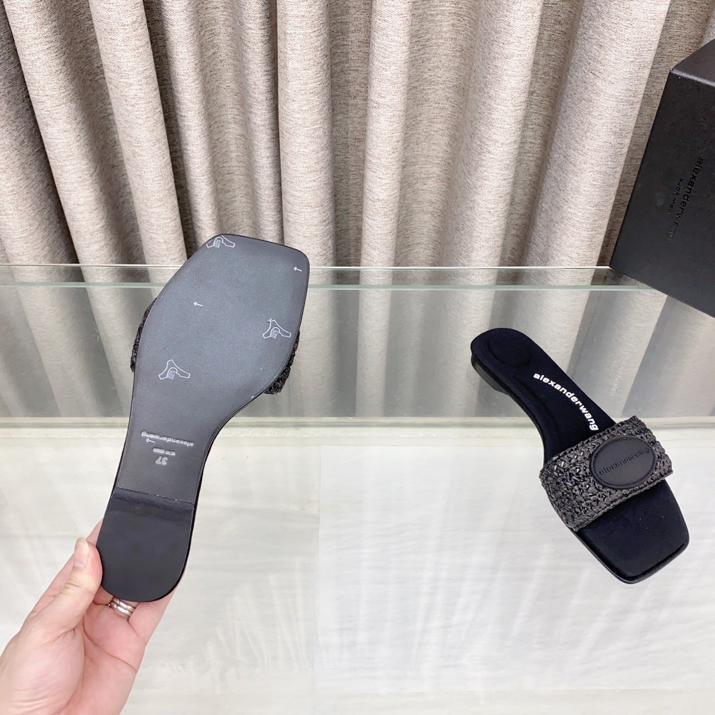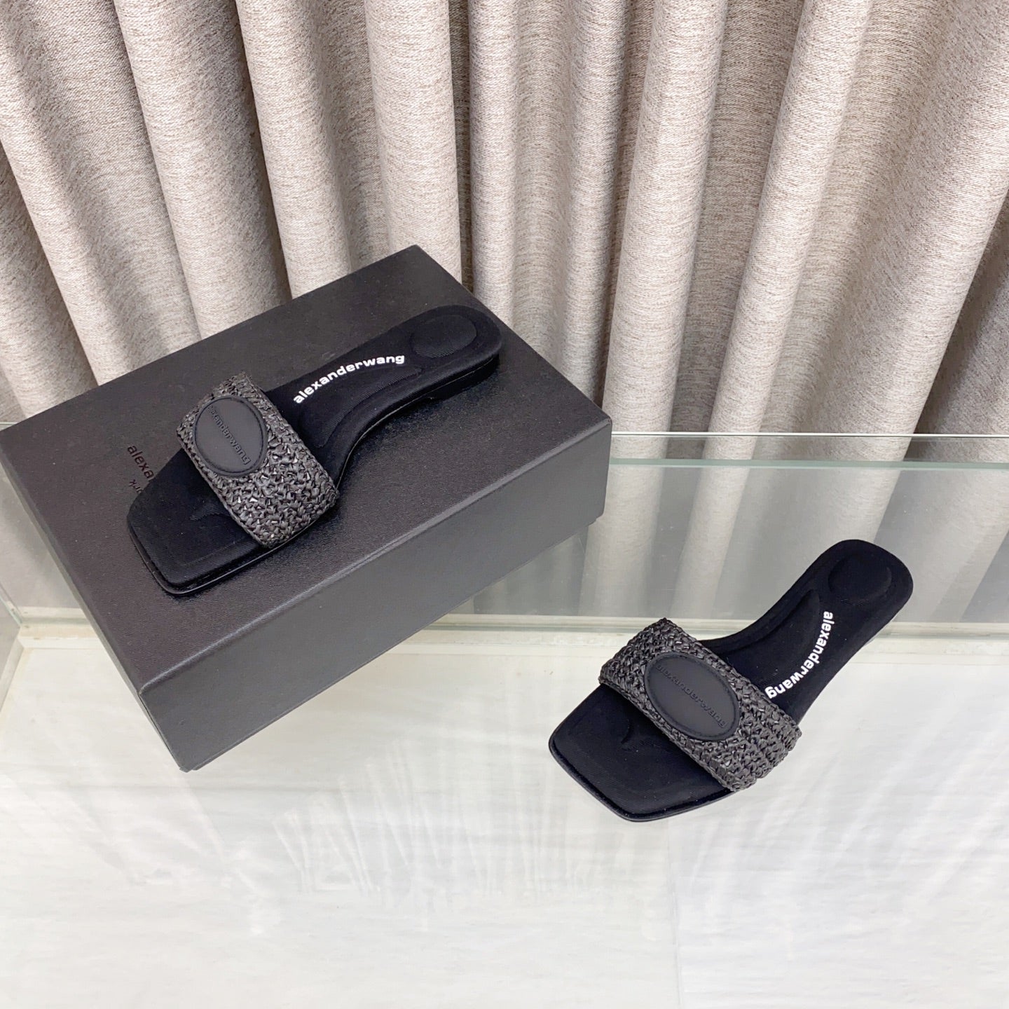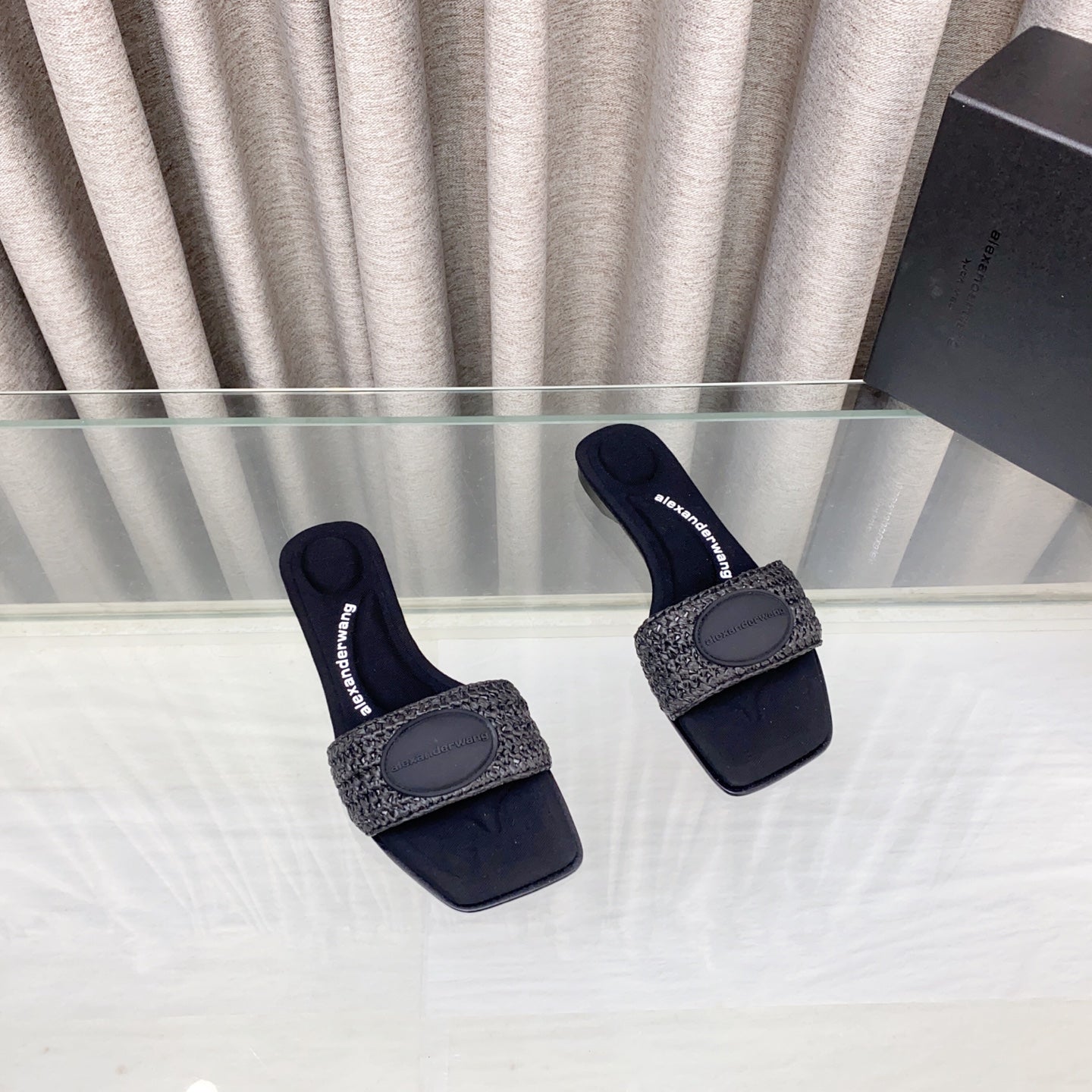 VY SLIDE SANDAL IN BLACK WOVEN RAFFIA STRAP AND CALFSKIN