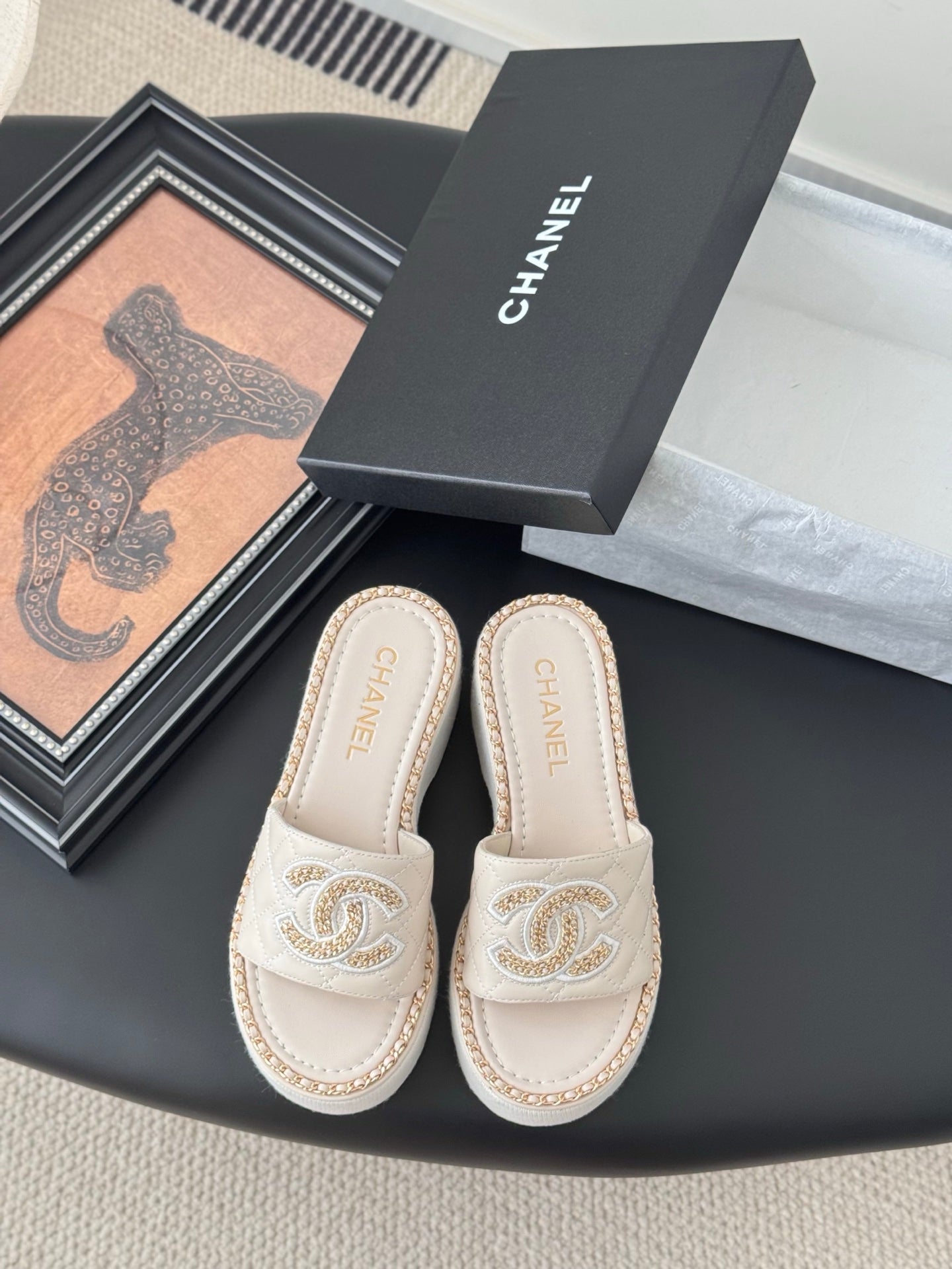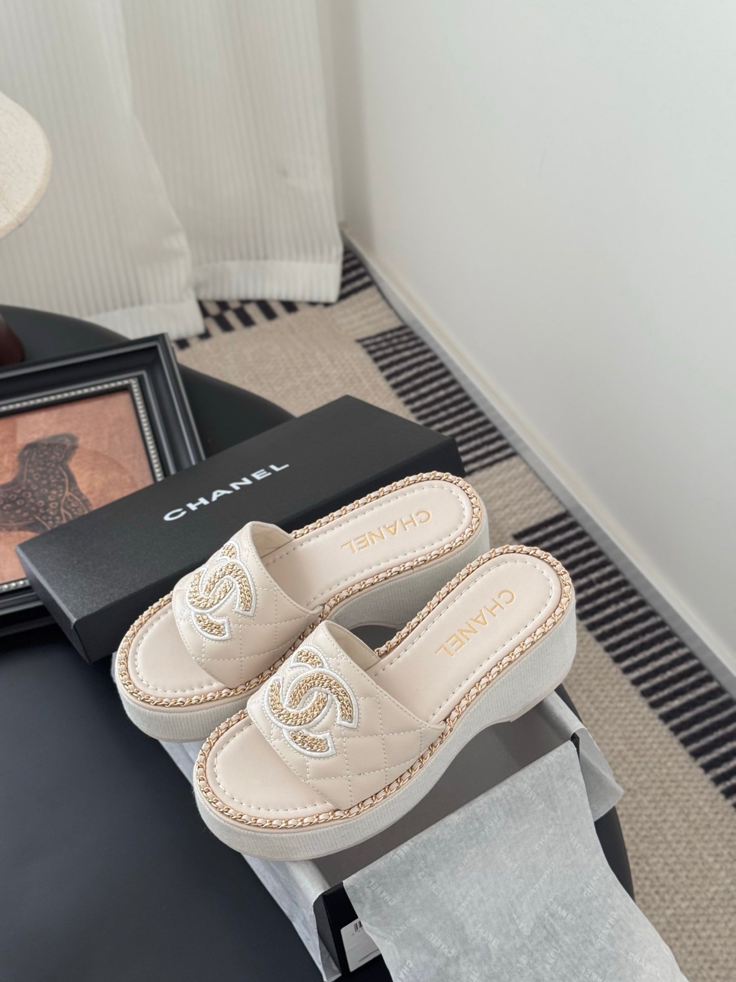 WEDGE HEELS IN HIGHT BEIGE CALFSKIN MIX CHAIN BASE