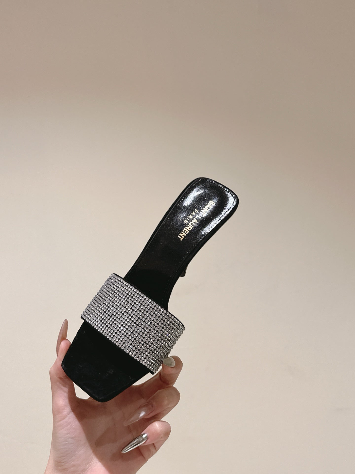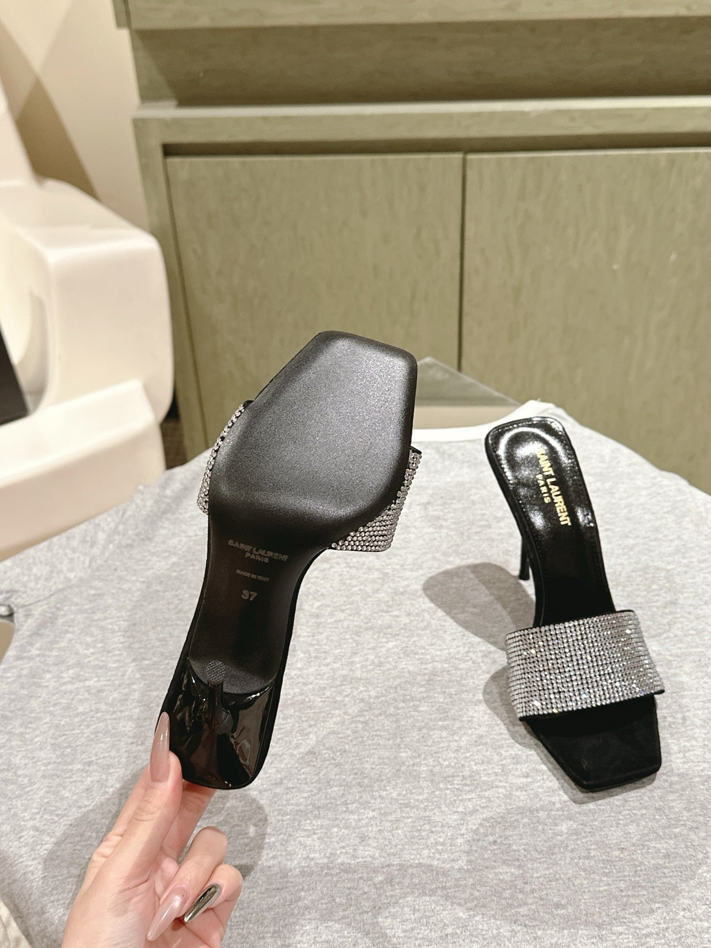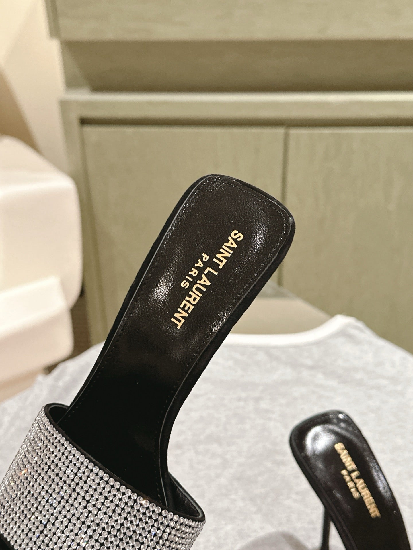 YSL 25S HEELED SANDALS 100 MM IN BLACK LAMBSKIN WITH WHITE RHINESTONE-EMBELLISHED STRAP