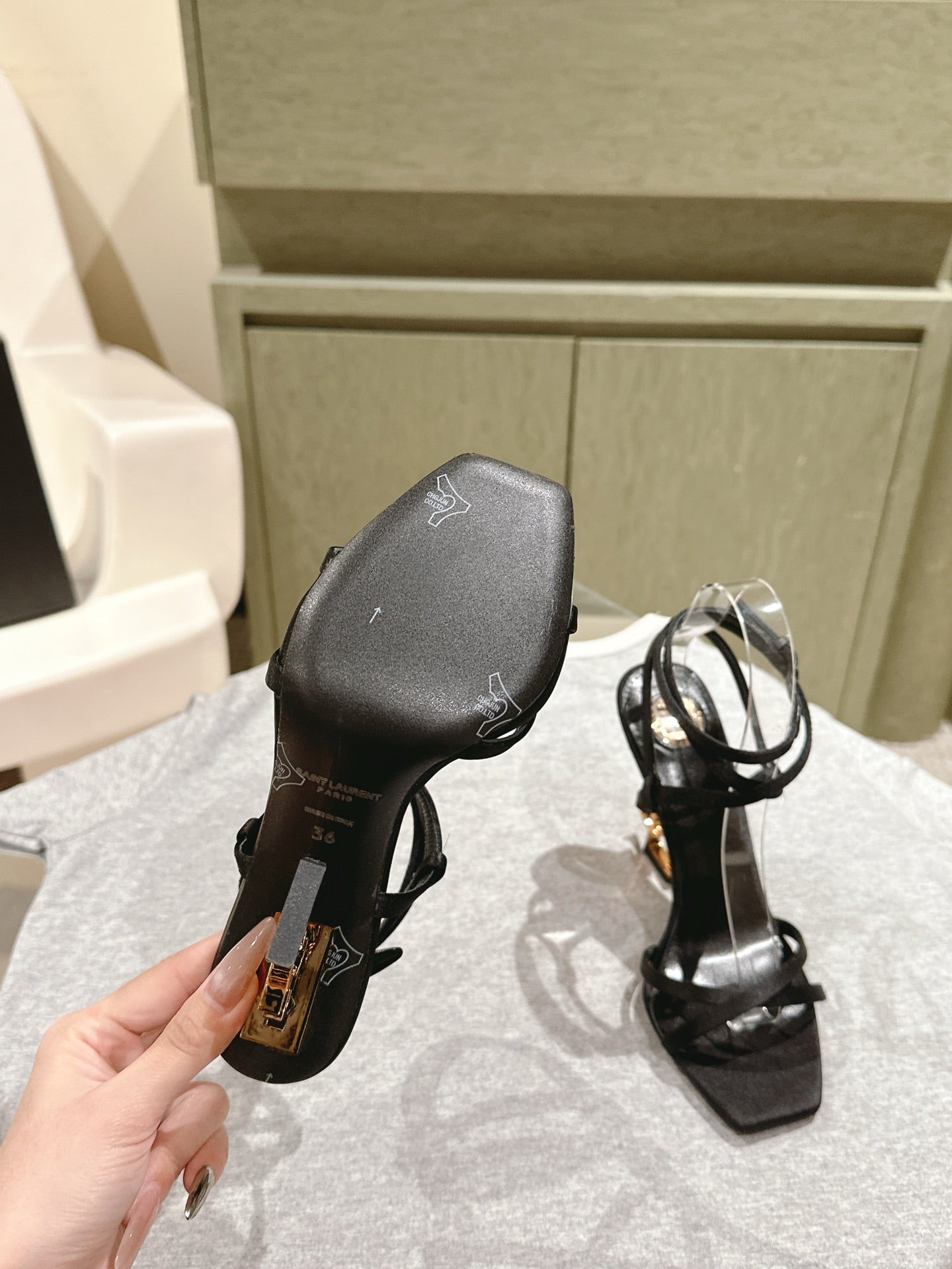 YSL 25S HIGH-HEEL SANDALS 100 MM IN BLACK SATIN WITH YSL LOGO HEEL DESIGN IN GOLD