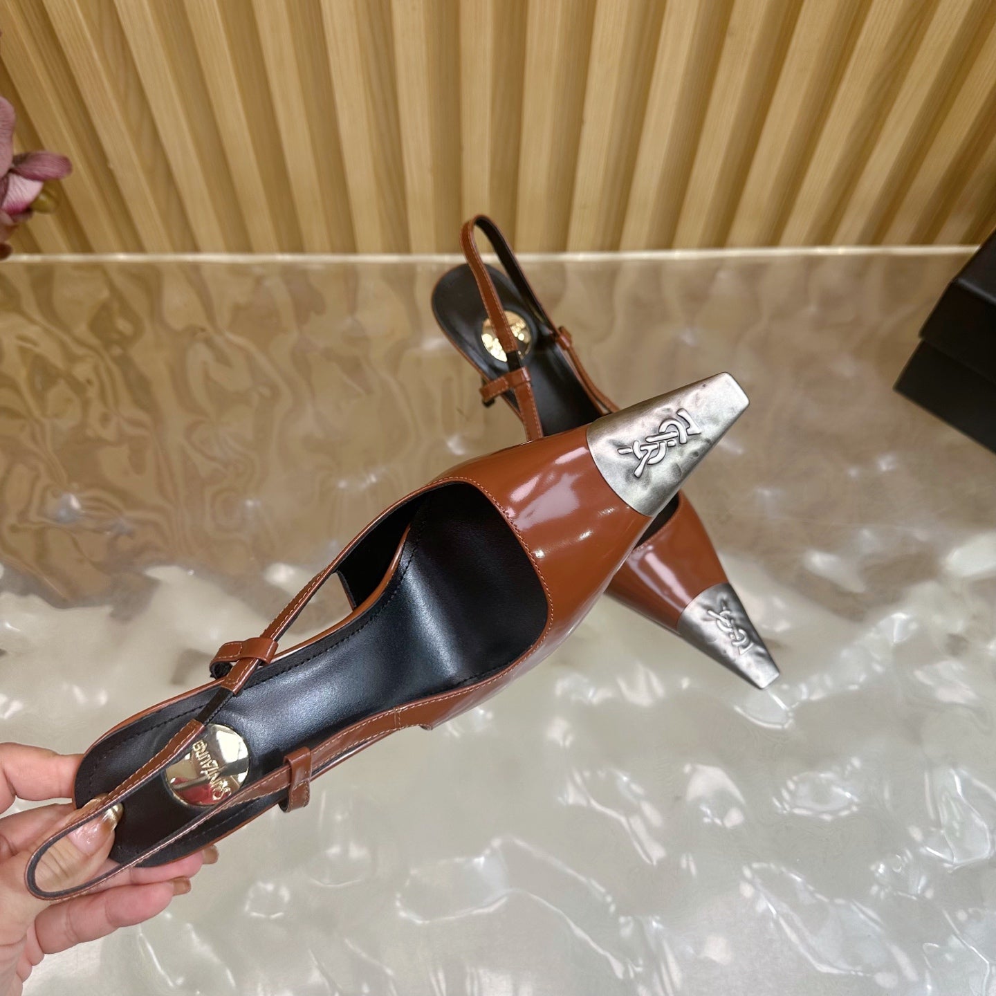 YSL 25S HIGH-HEEL SLINGBACKS 105 MM IN REDWOOD BROWN LAMBSKIN AND SILVER HARDWARE