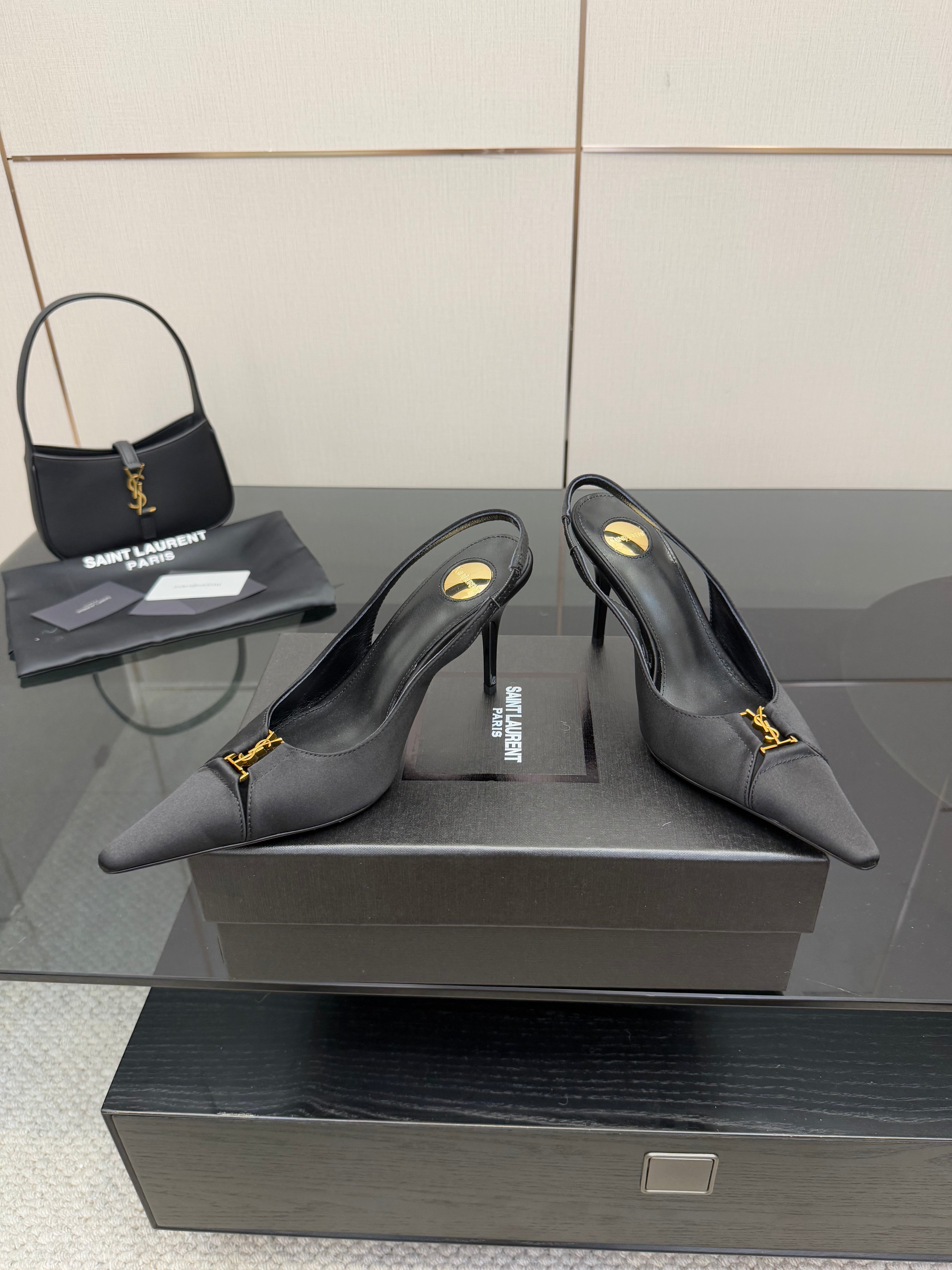 YSL 25S SLINGBACK HIGH HEELS 90 MM IN BLACK SATIN WITH GOLD HARDWARE STYLE 18