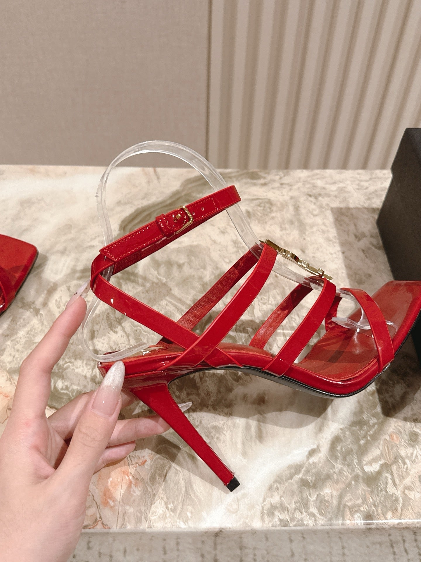 YSL 25S STILETTO HIGH-HEEL SANDALS 100 MM IN RED LAMBSKIN WITH GOLD HARDWARE