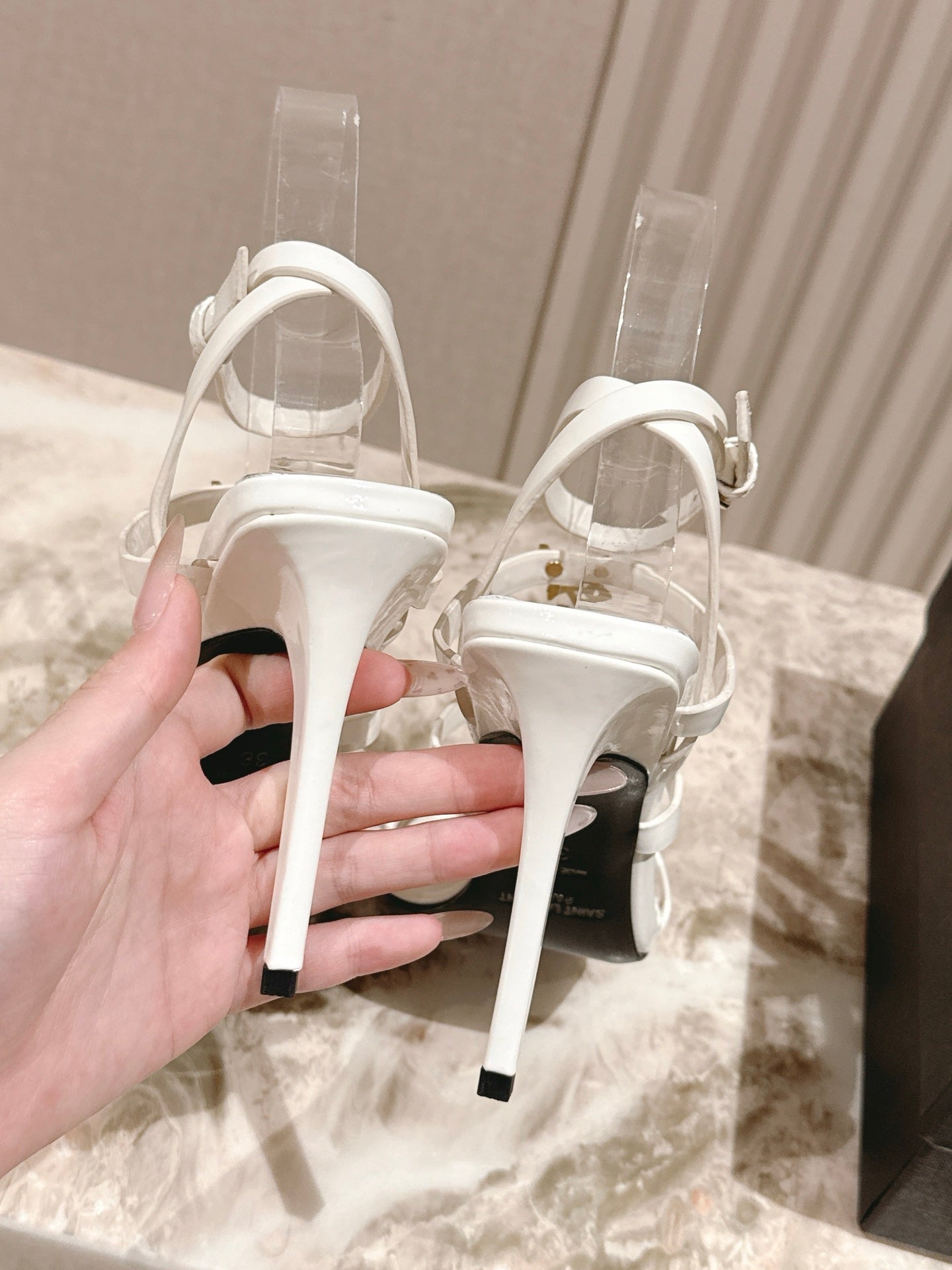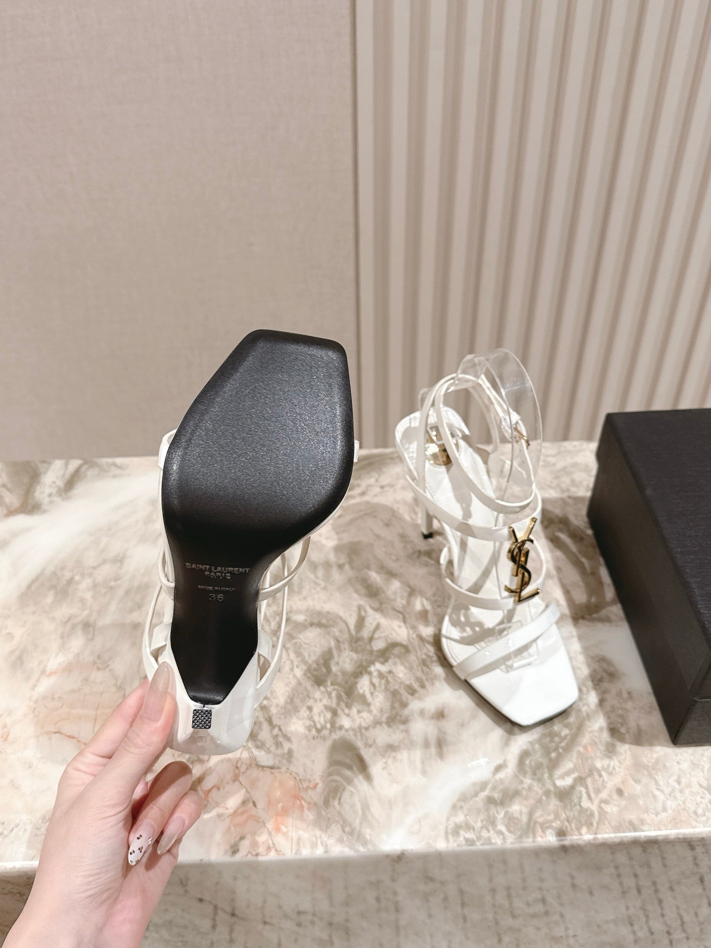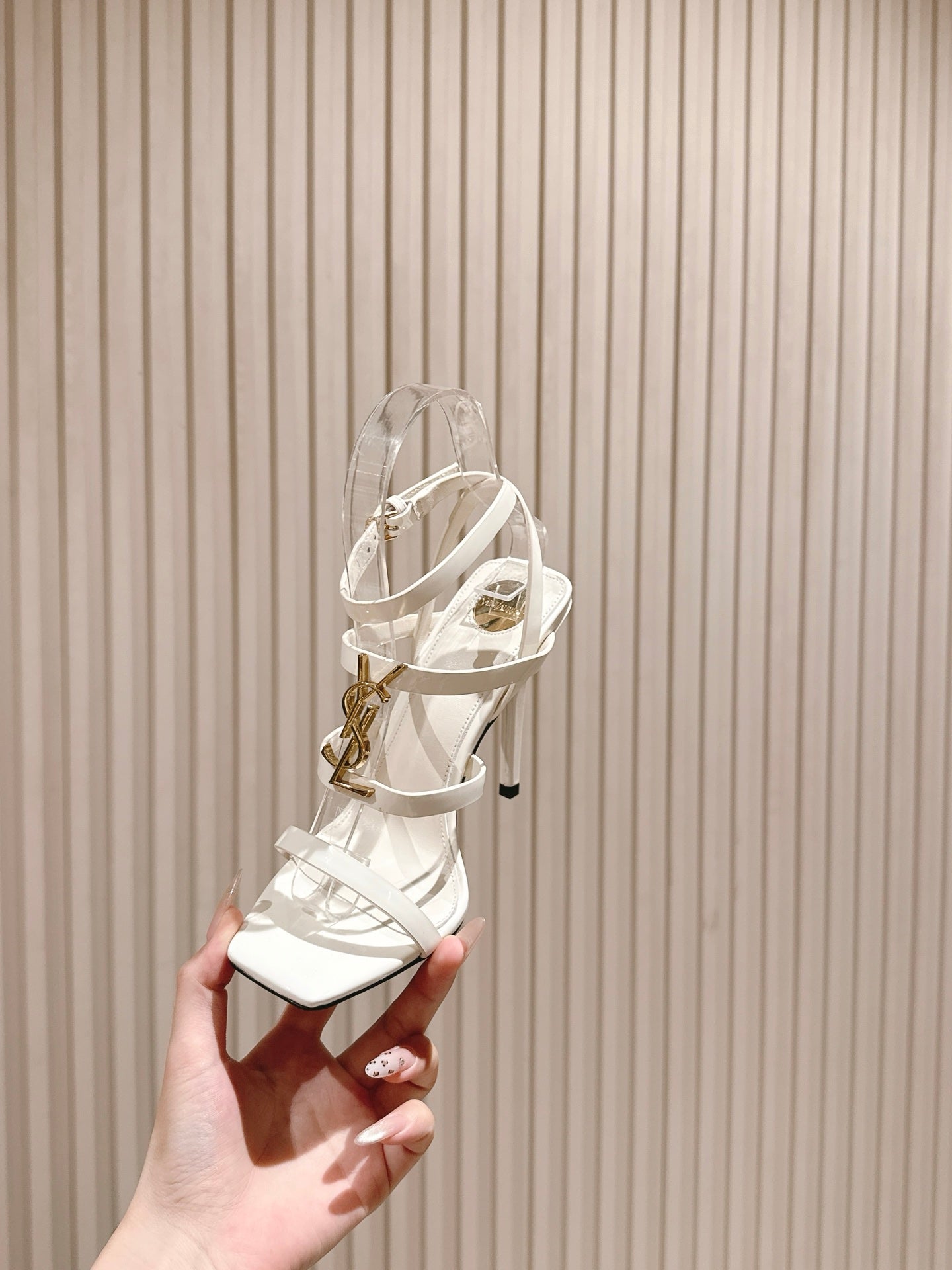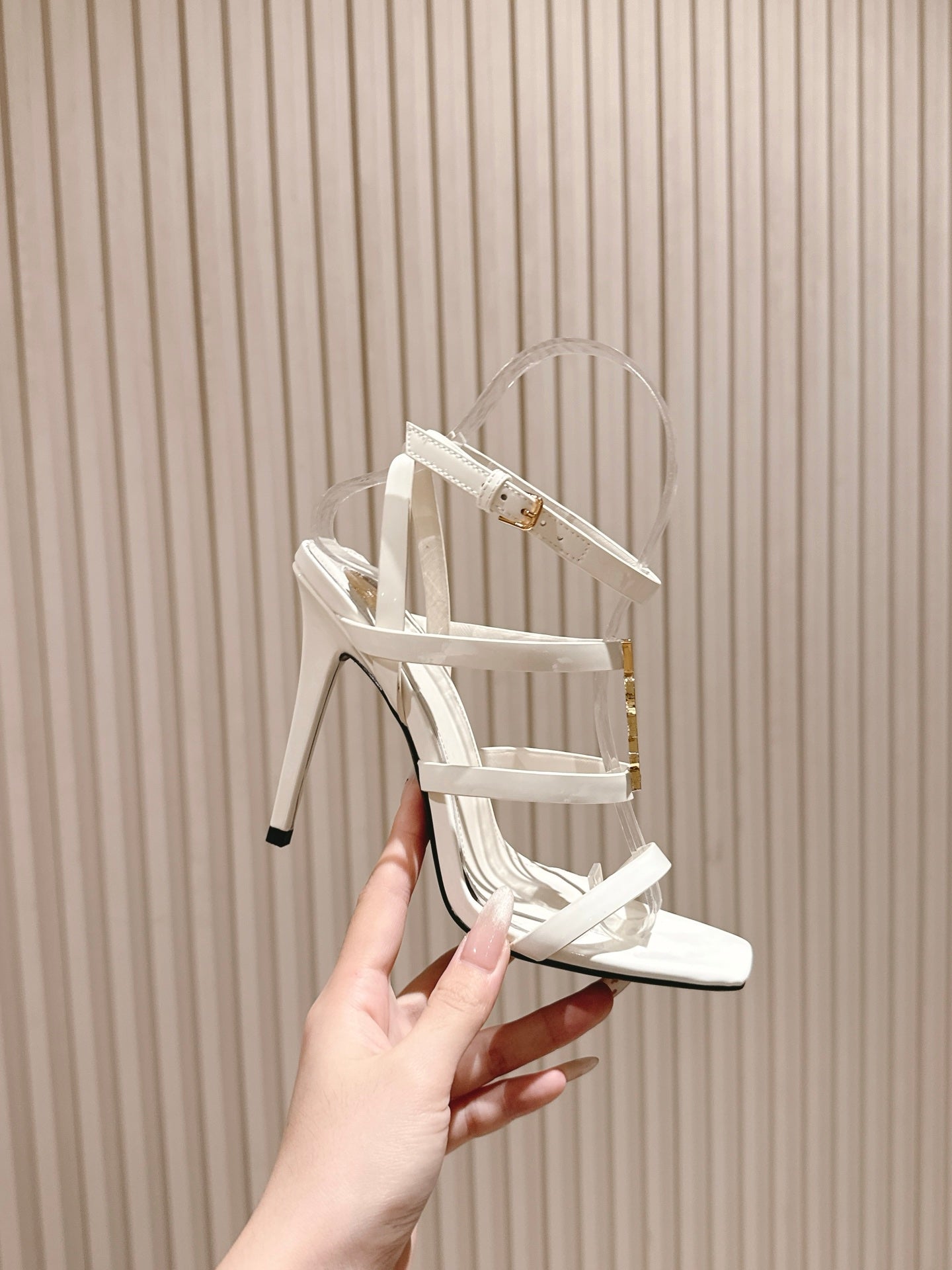 YSL 25S STILETTO HIGH-HEEL SANDALS 100 MM IN WHITE LAMBSKIN WITH GOLD HARDWARE