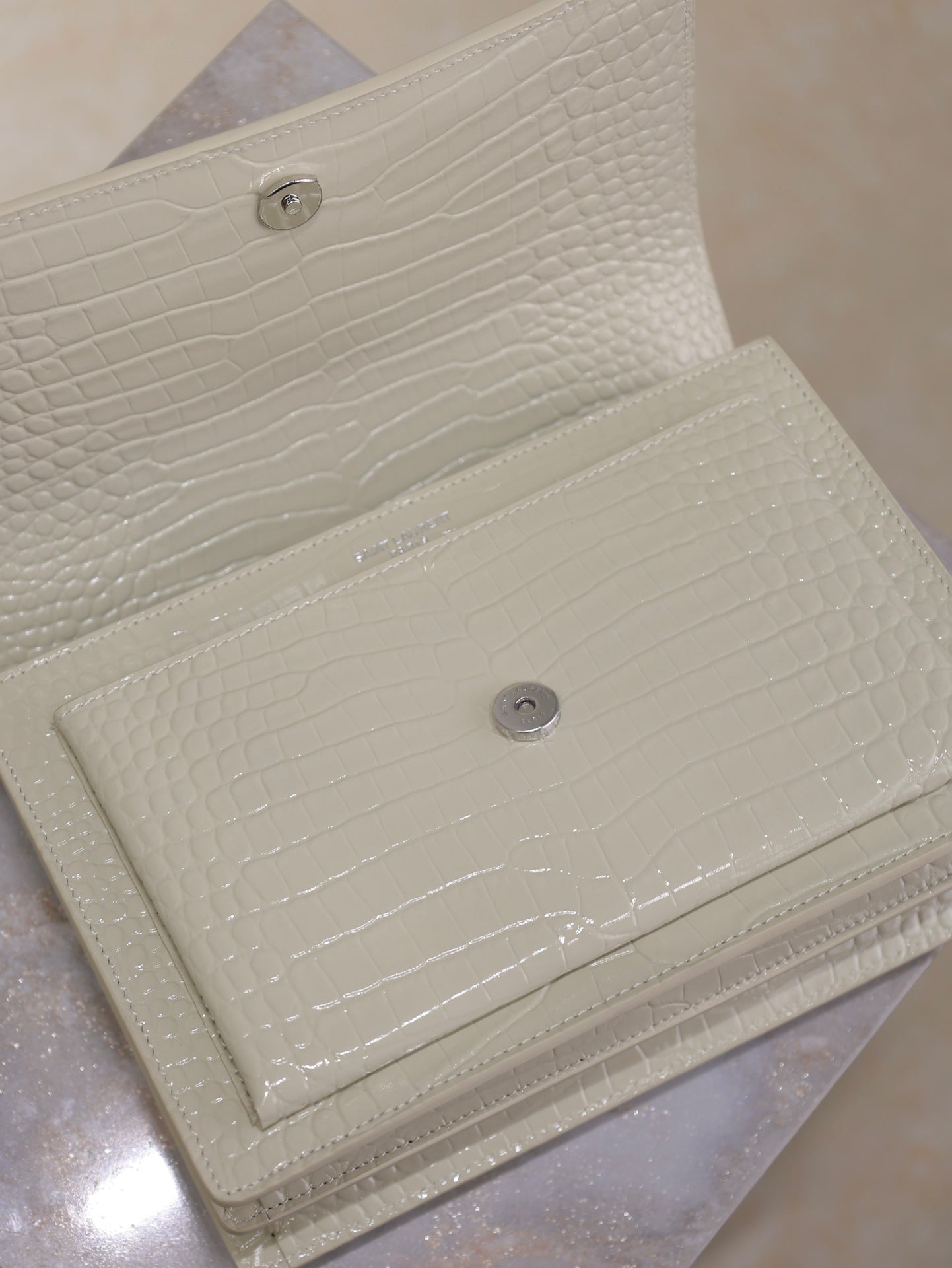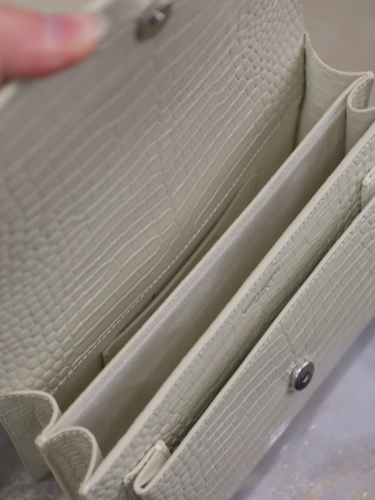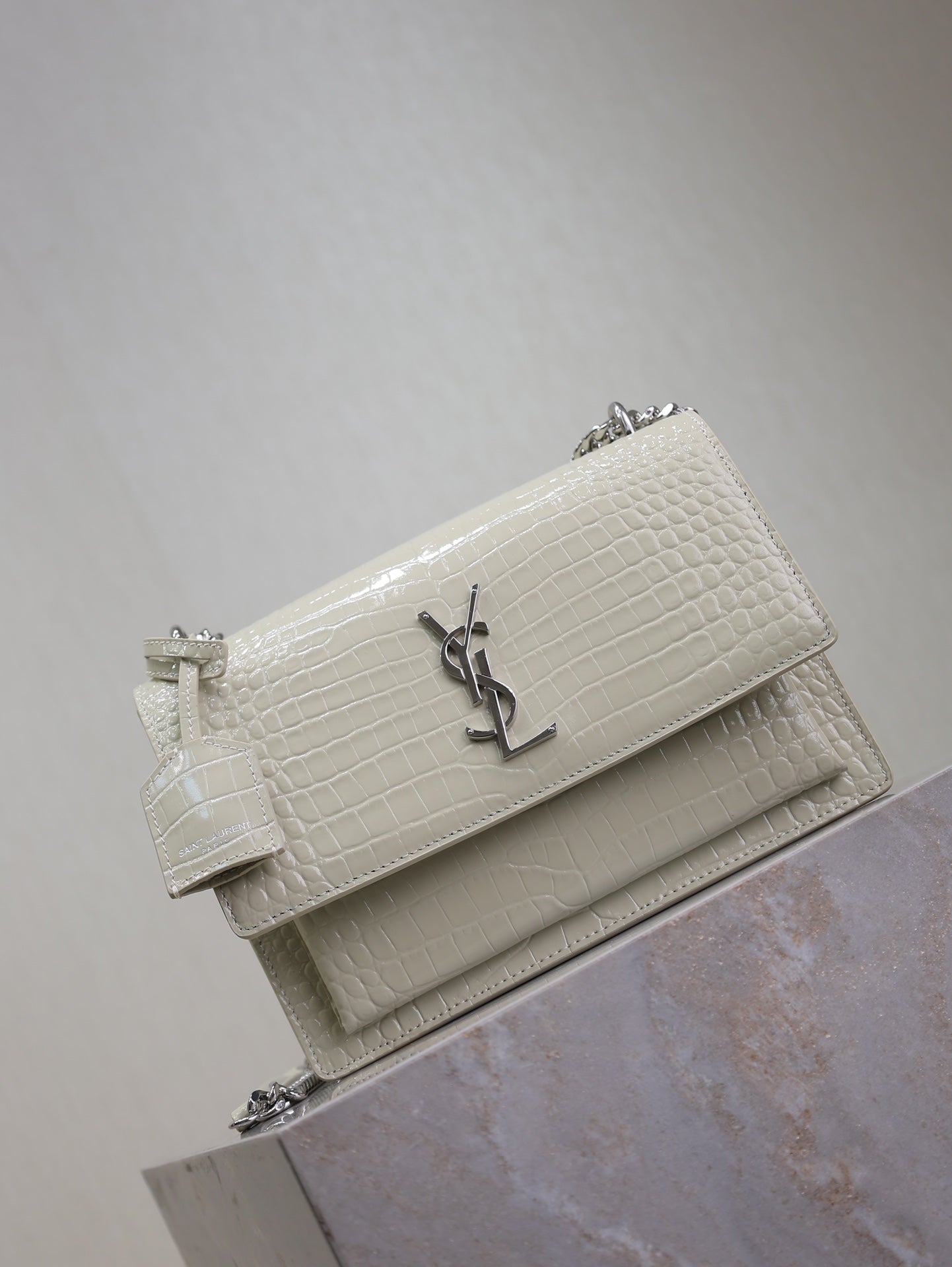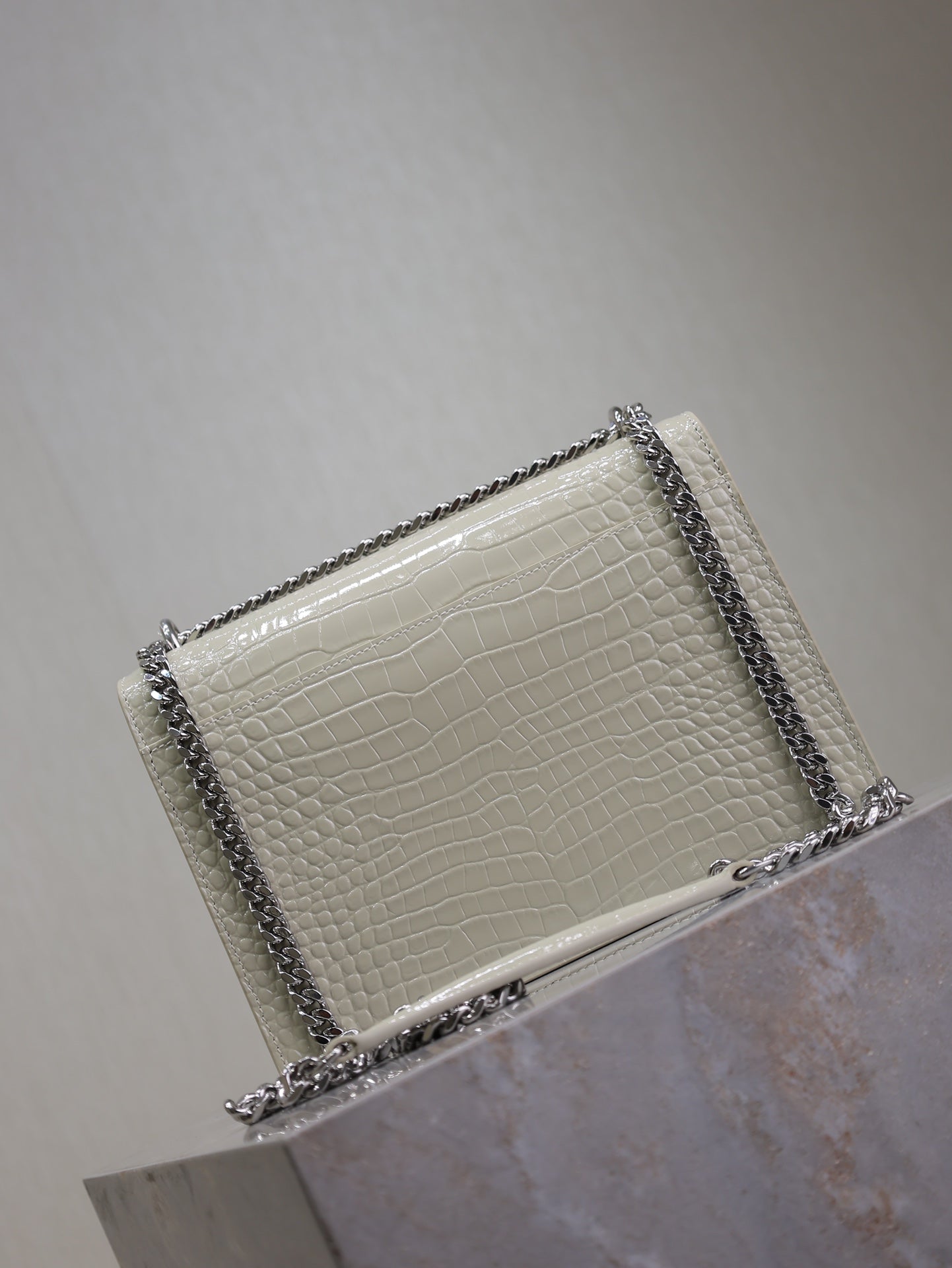 YSL 25S SUNSET MEDIUM 22 IN IVORY CROCODILE-EMBOSSED SHINY CALFSKIN SILVER HARDWRE