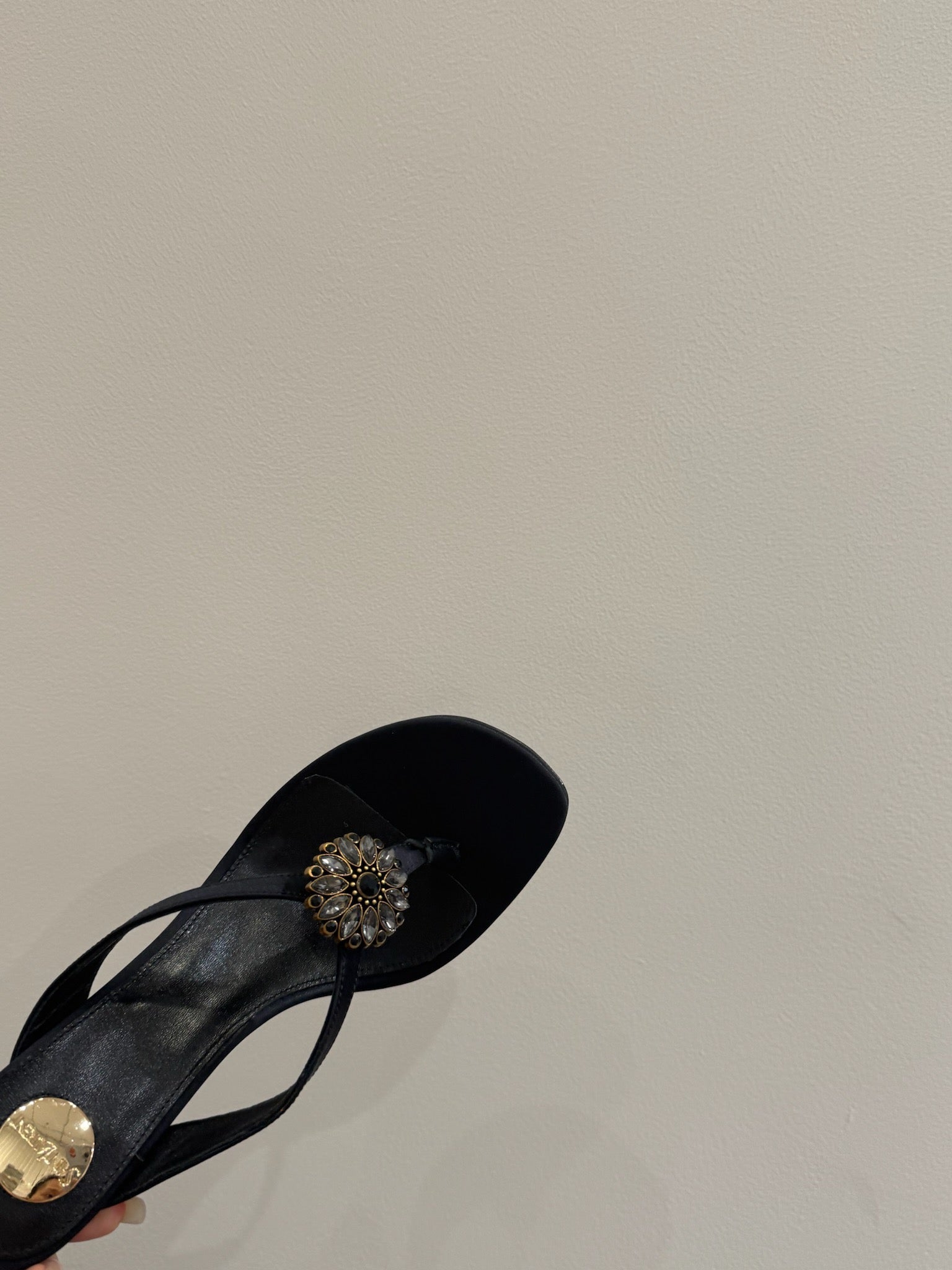 YSL HEELED THONG SANDALS 25S IN BLACK SATIN WITH CRYSTAL
