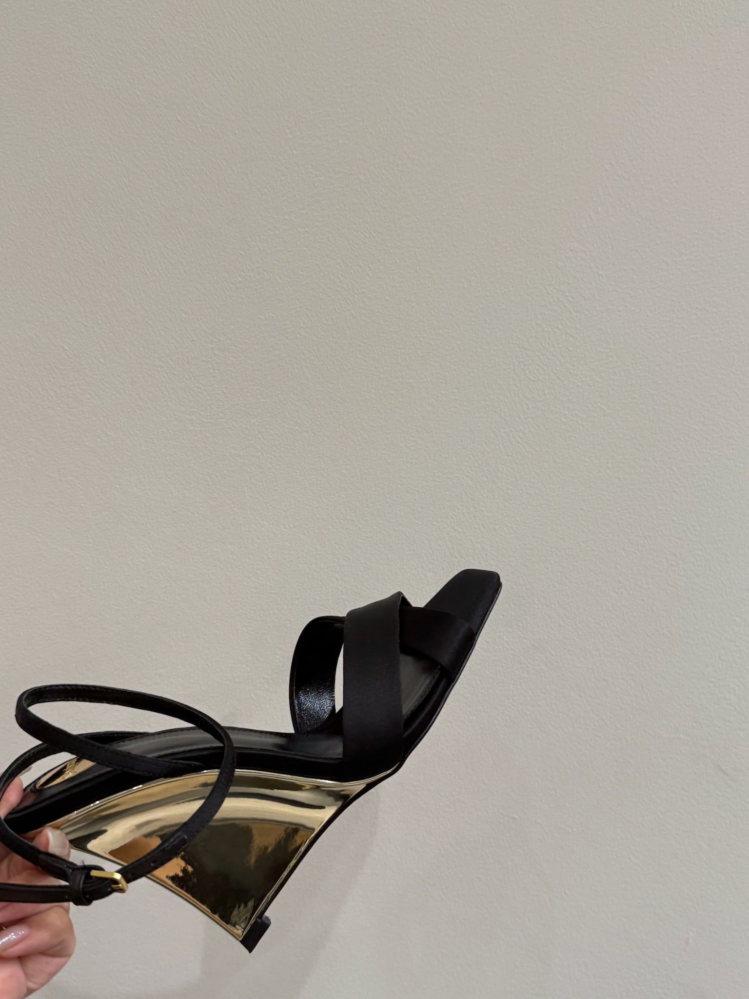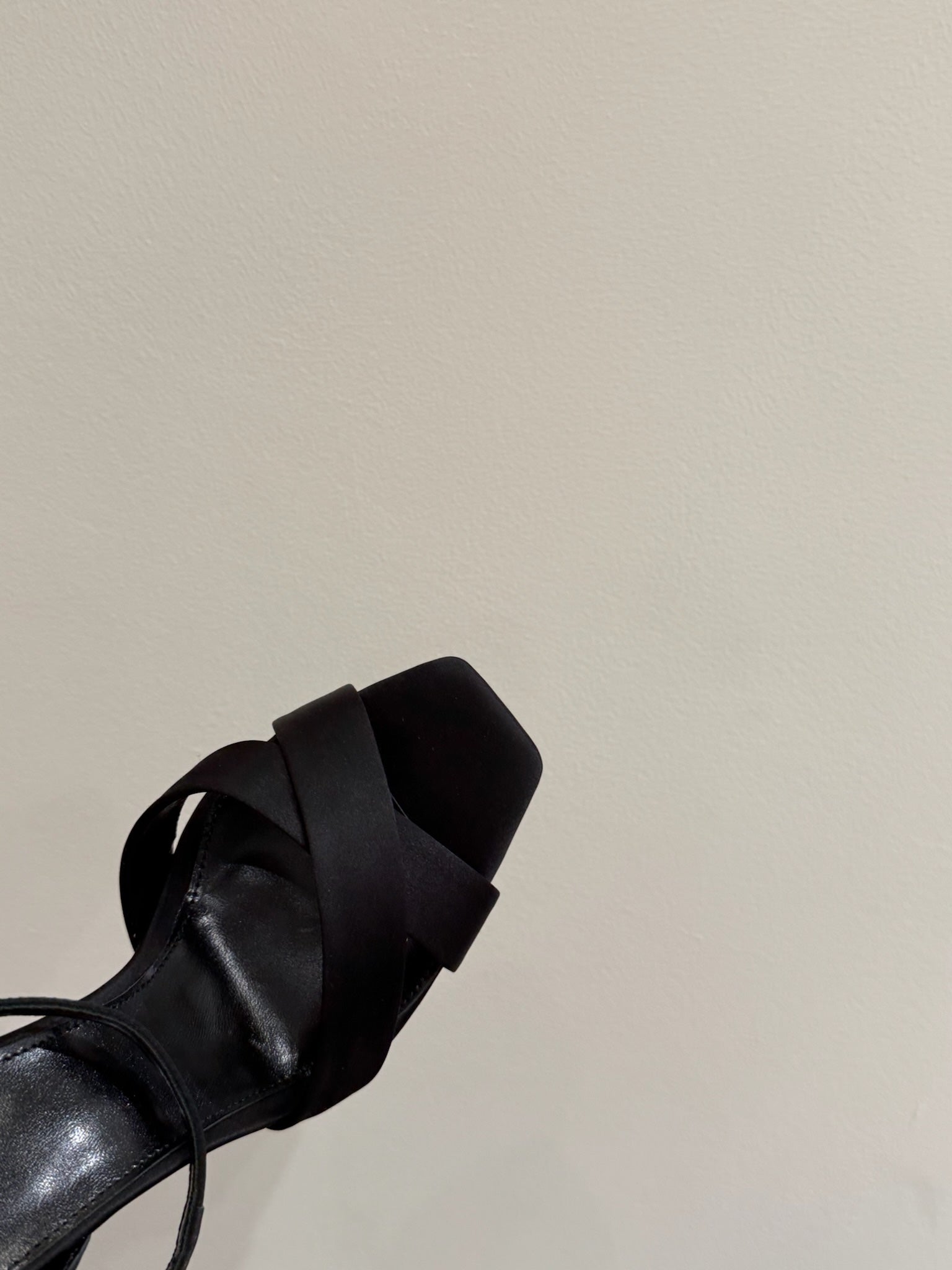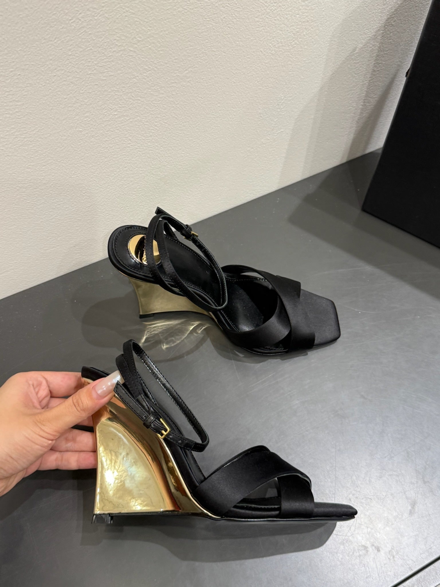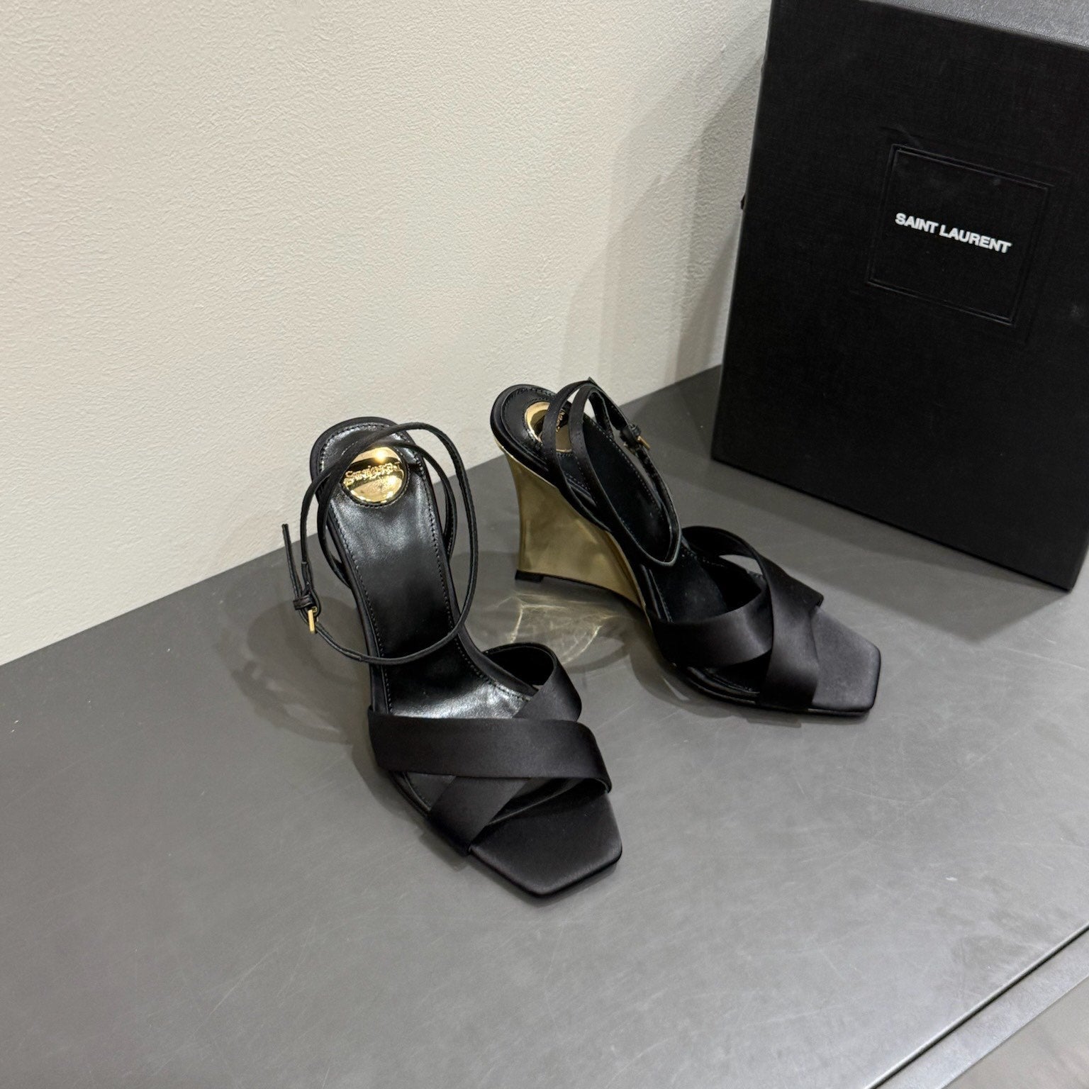 YSL STRAPPY WEDGE SANDALS 25S IN BLACK SATIN