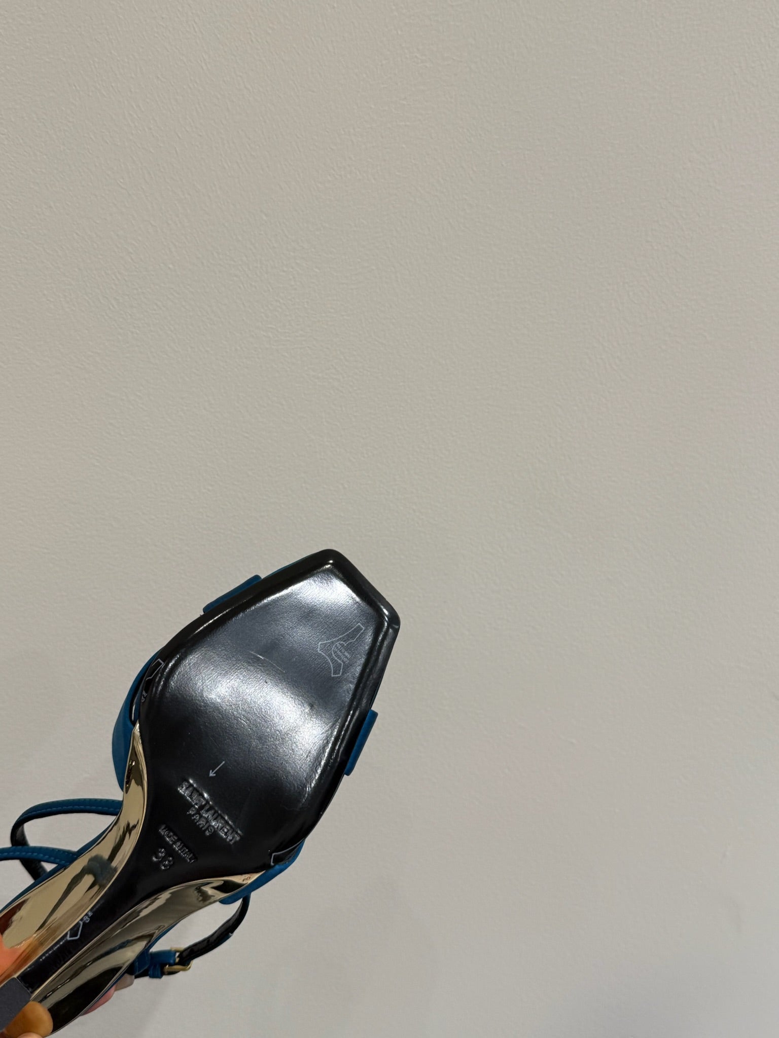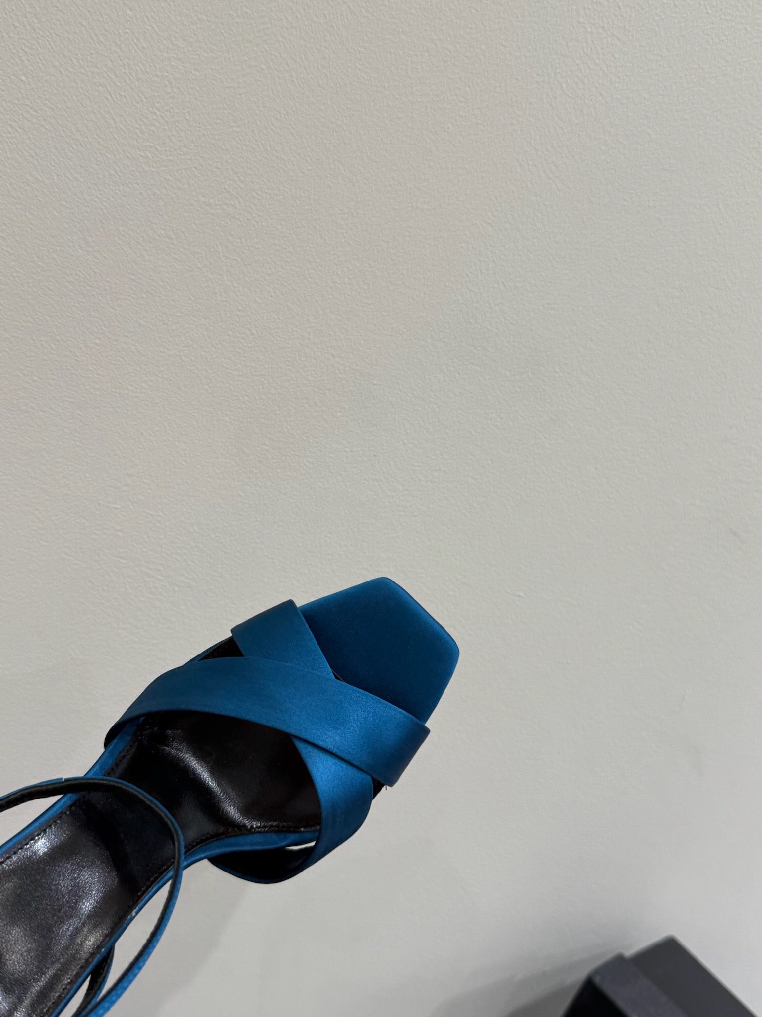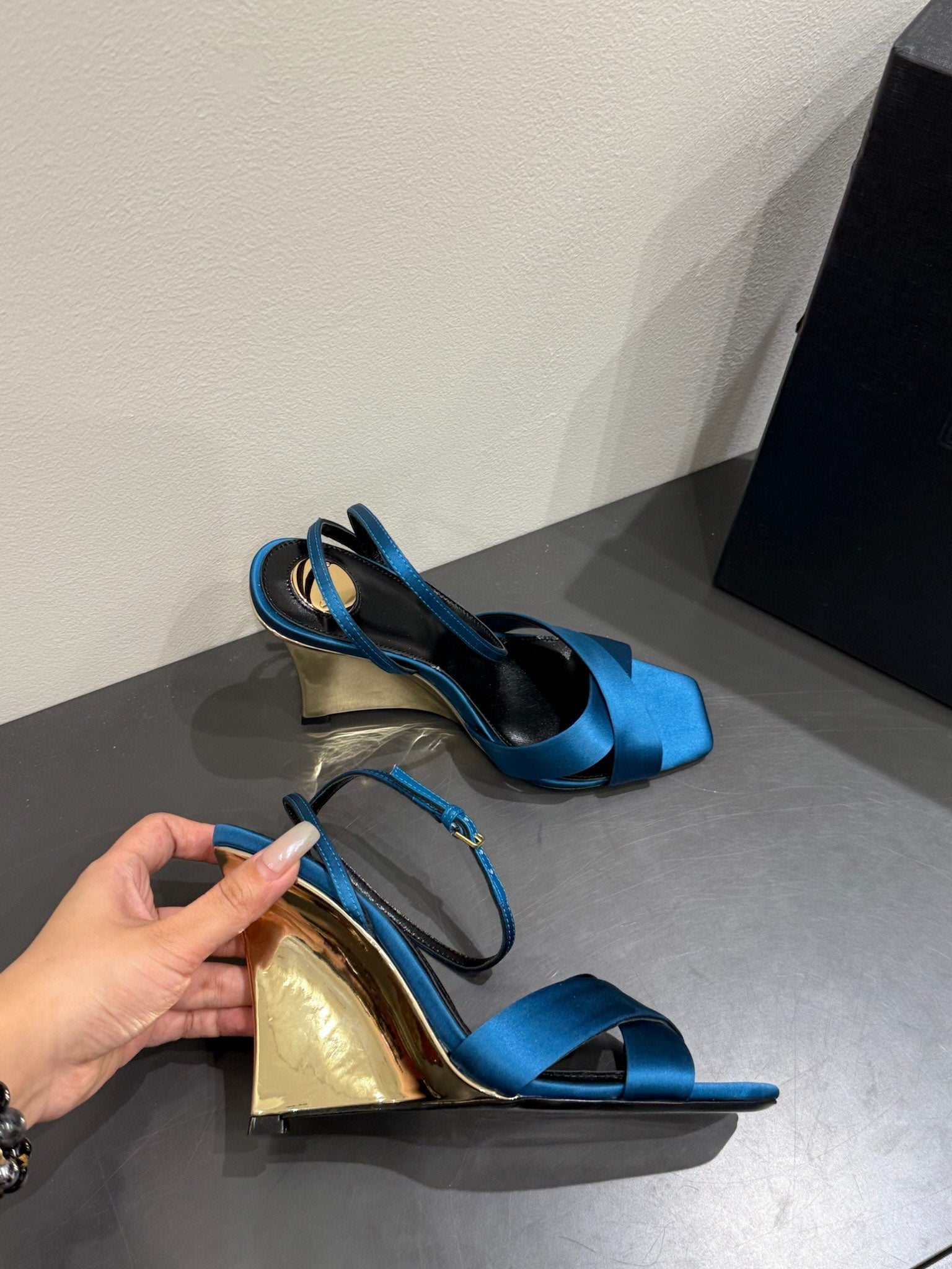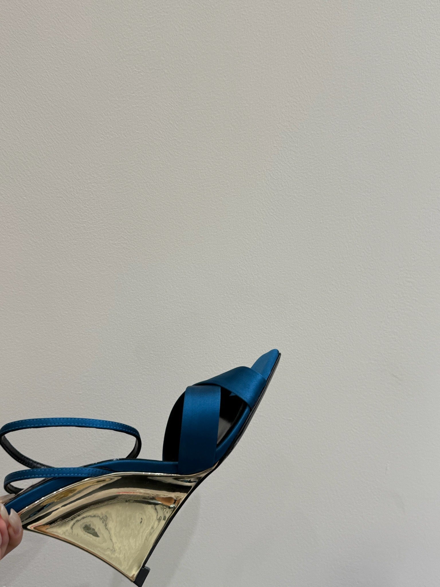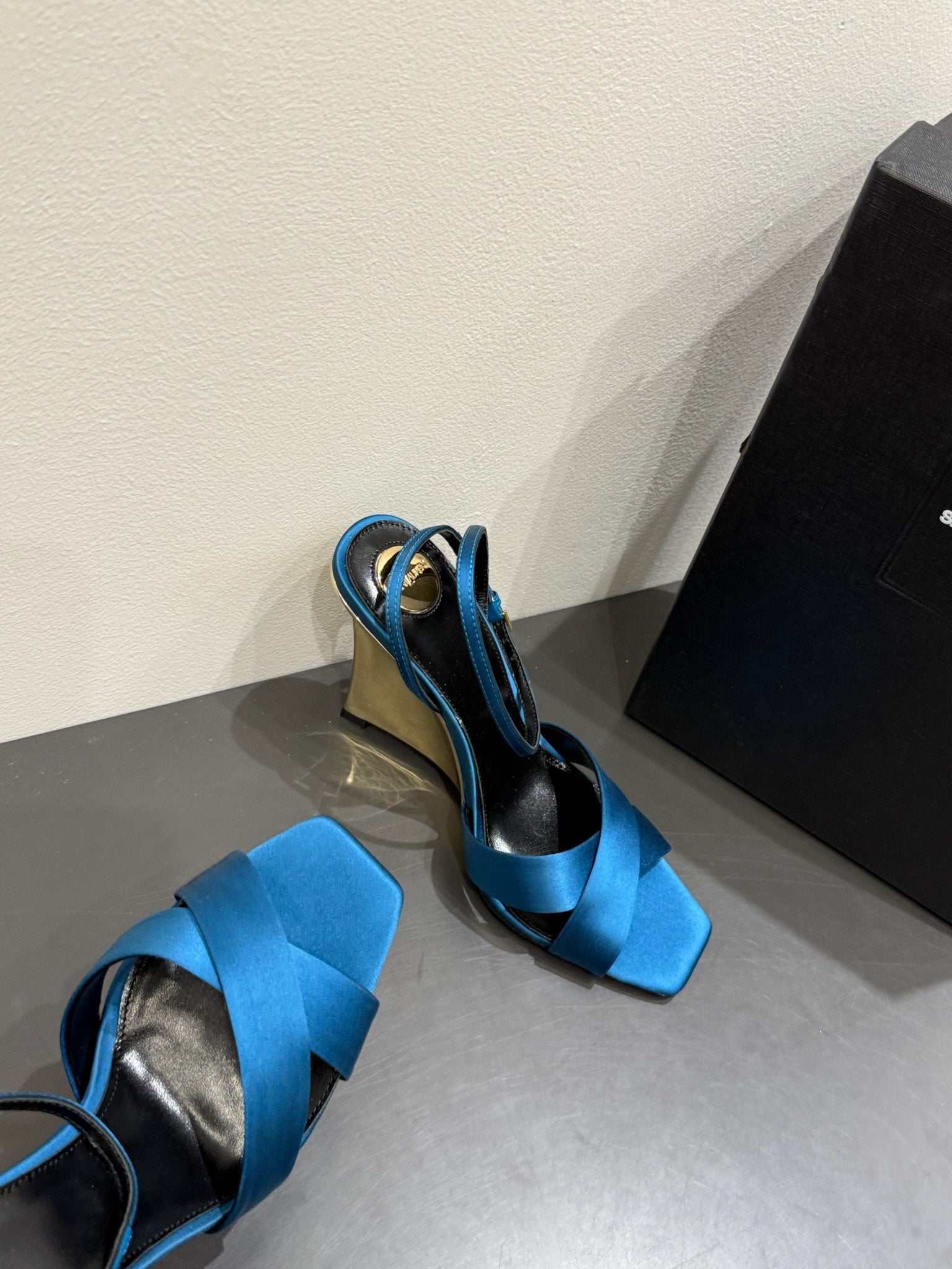 YSL STRAPPY WEDGE SANDALS 25S IN DARK BLUE SATIN